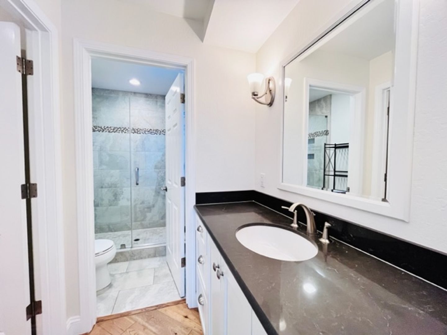 The primary bedroom features vaulted ceilings, ceiling fan with lighted fixtures, and en suite bathroom. The primary bathroom features walk-in closet, single sink vanity with solid stone countertop, step-in shower with clear glass enclosure and separate water closet. Bedrooms 2 & 3 are of equal sizes and feature standard-sized closets. The hall bath features a single sink vanity, granite countertop and a shower-over-tub combo shower.