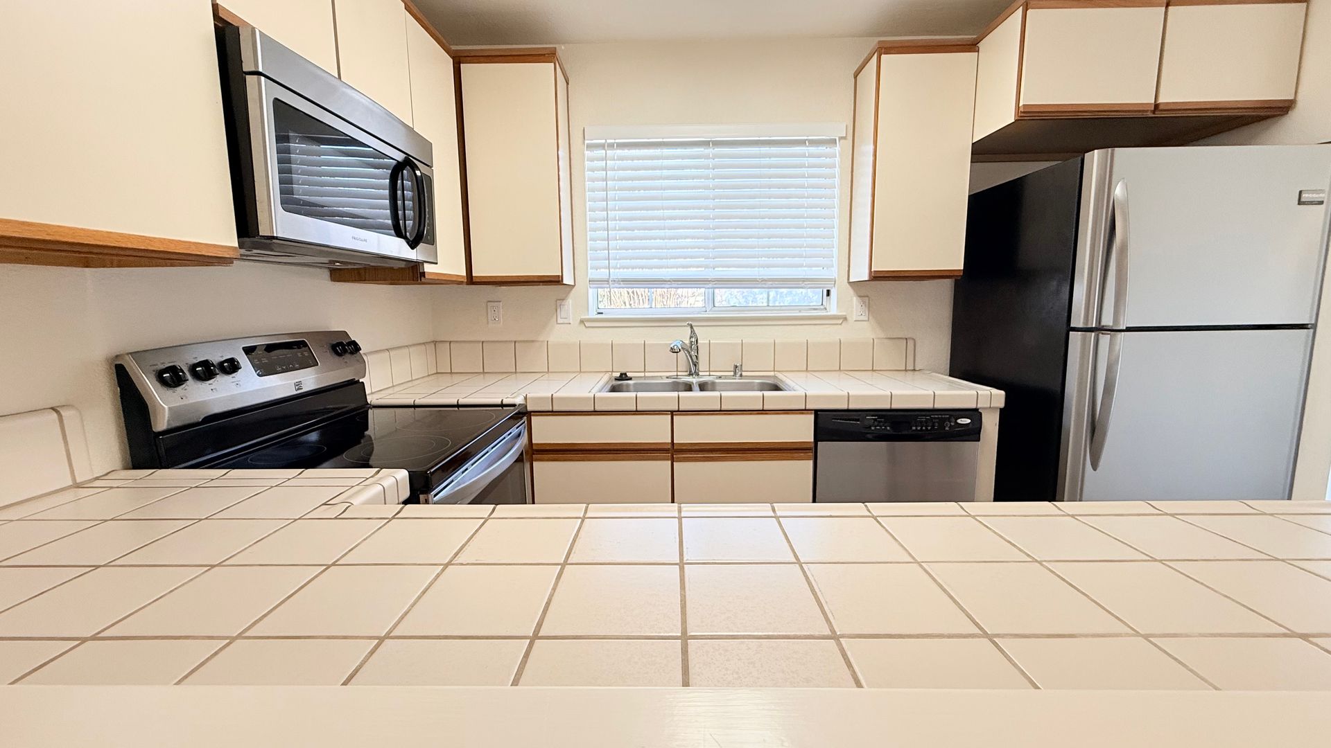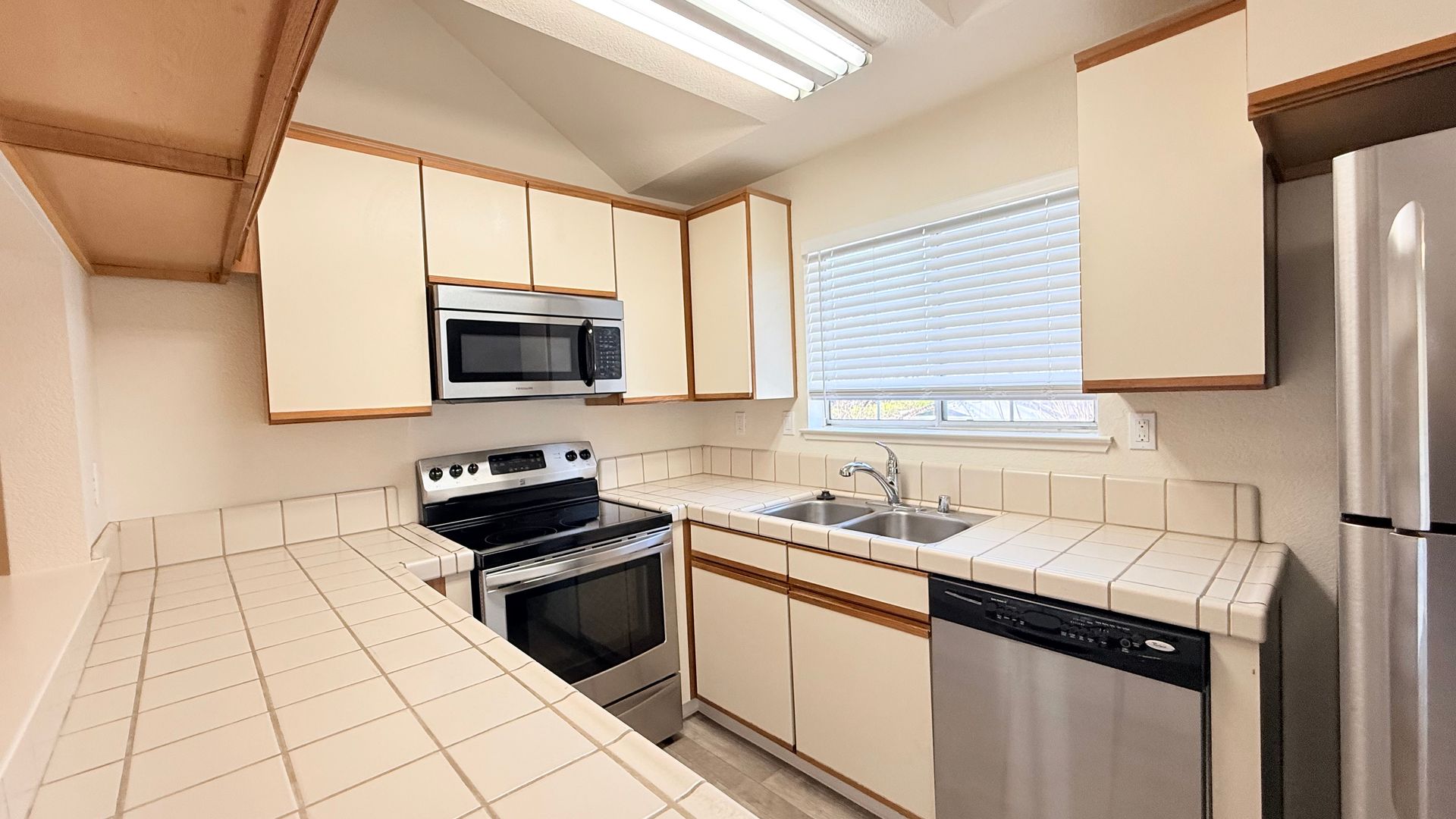 Living room features vaulted ceilings, gas fireplace and slider leading to balcony overlooking the pool. Kitchen features tiled counters, refrigerator, dishwasher, electric stove/oven and breakfast nook with slider leading to rear balcony. Adjoining dining room with vaulted ceilings.