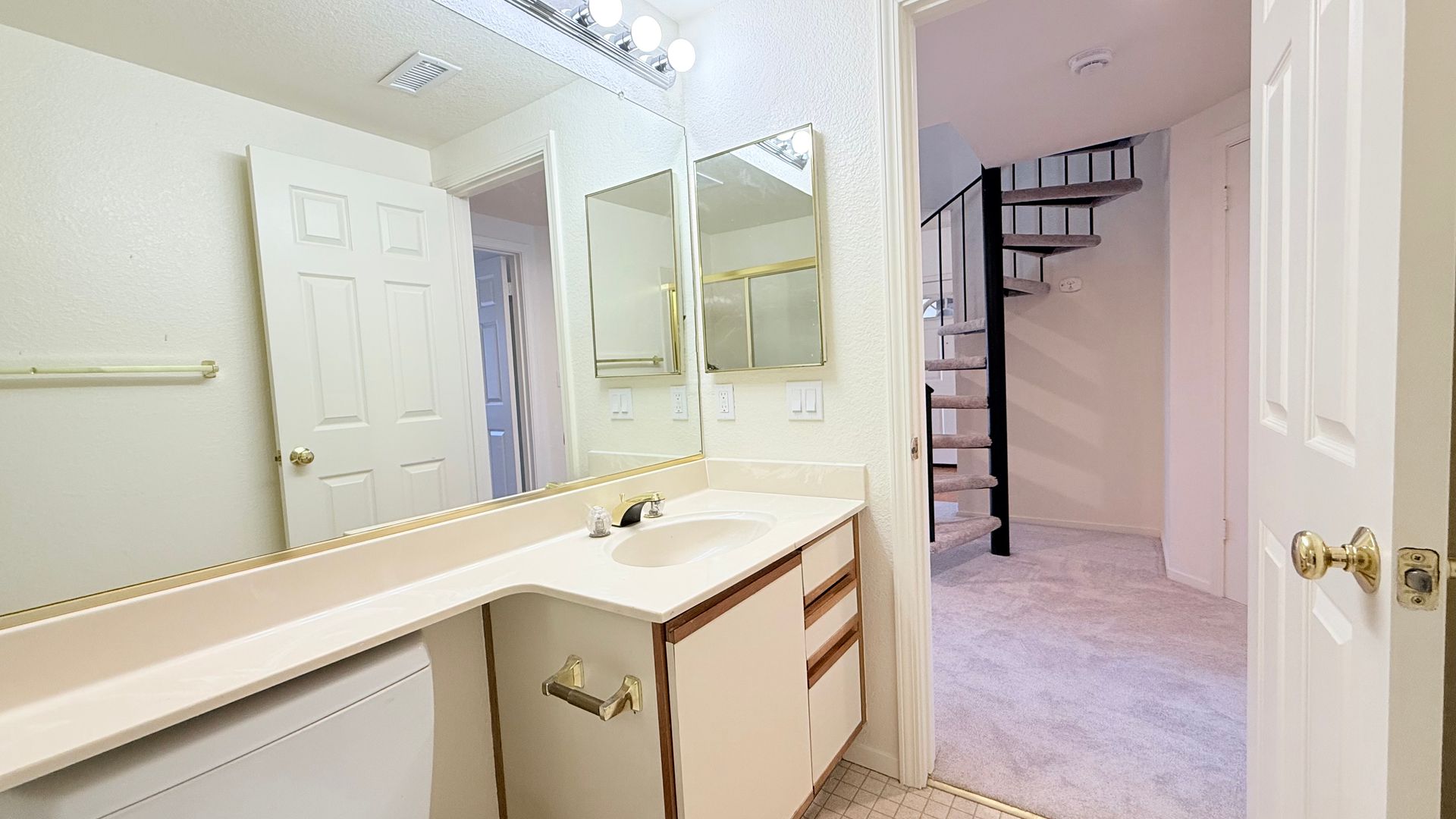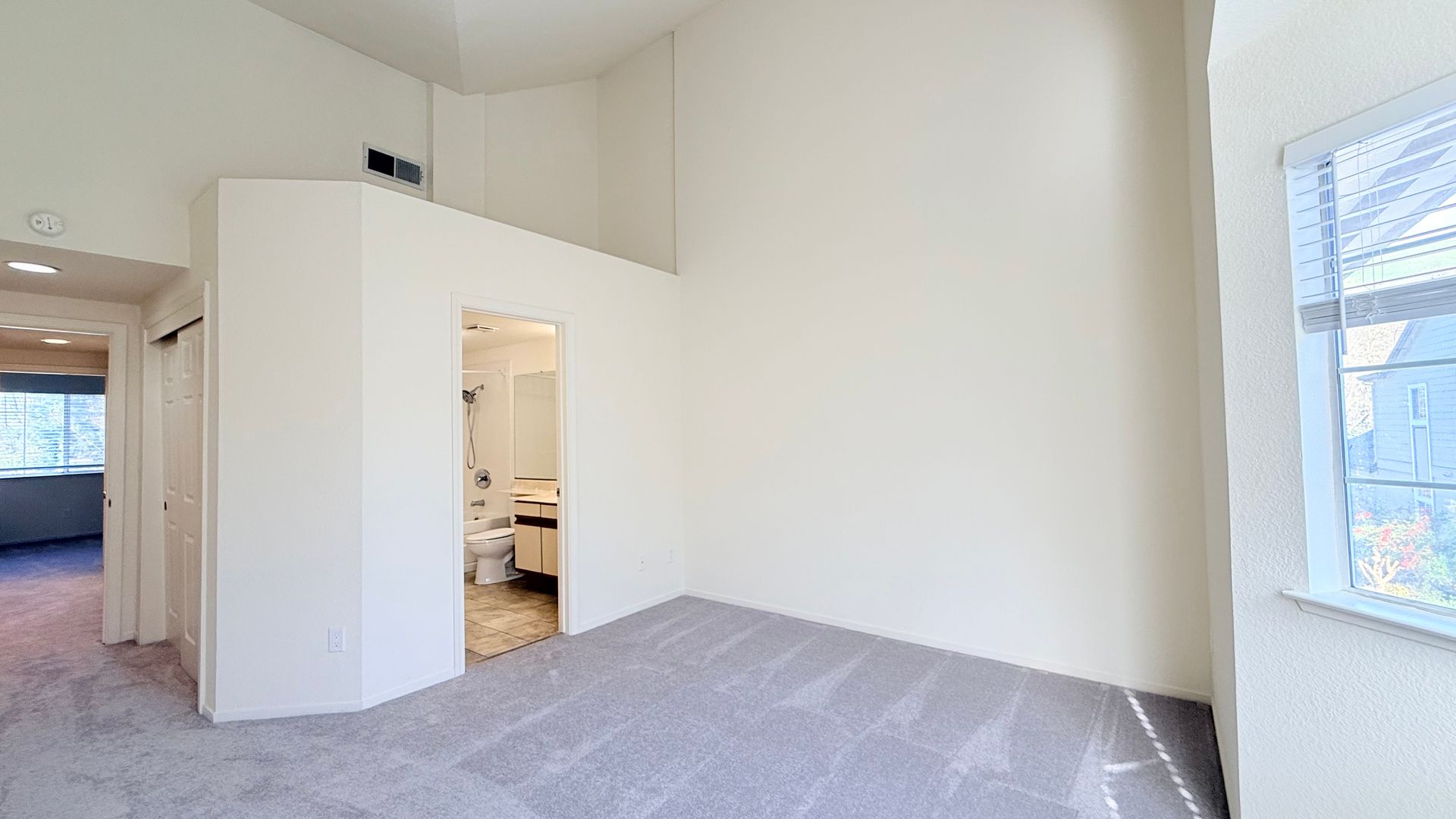 Primary bedroom features vaulted ceilings, window alcove, standard closets and an en suite bathroom. The primary bathroom features tiled floor, single sink vanity with solid surfaced countertops and extra-large shower-over-tub. Bedrooms 2 is good size with standard closet and vaulted ceilings. Hall bath features single sink vanity with solid surface countertops and shower-over-tub with clear glass enclosure. Spiral staircase leads to loft area, perfect for home office or media room.
