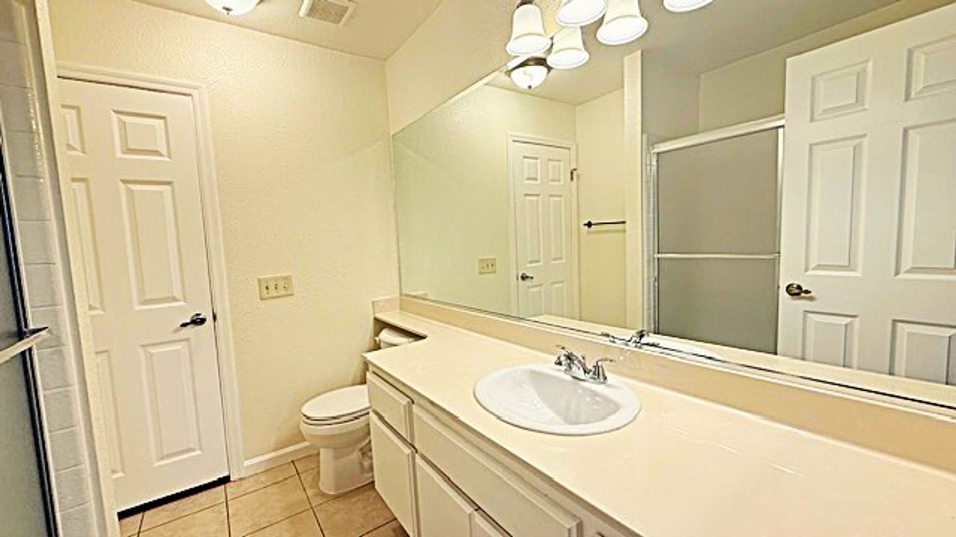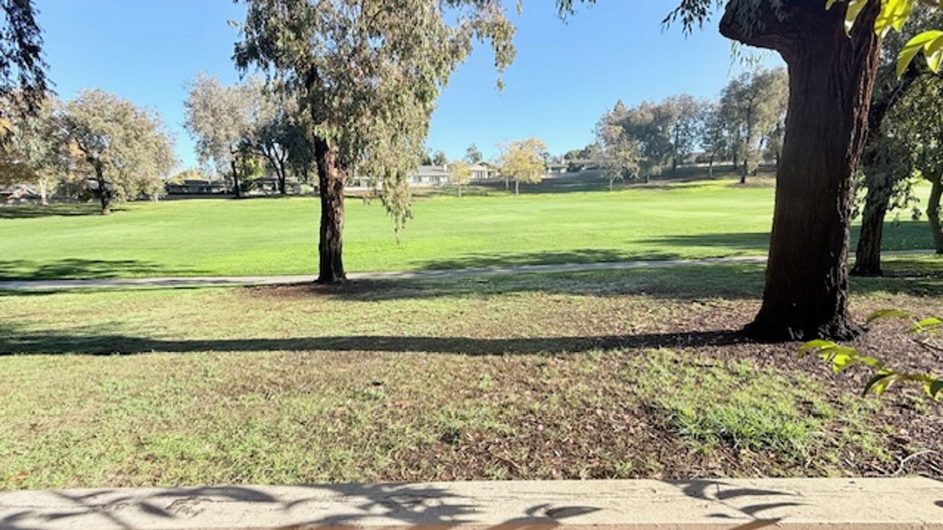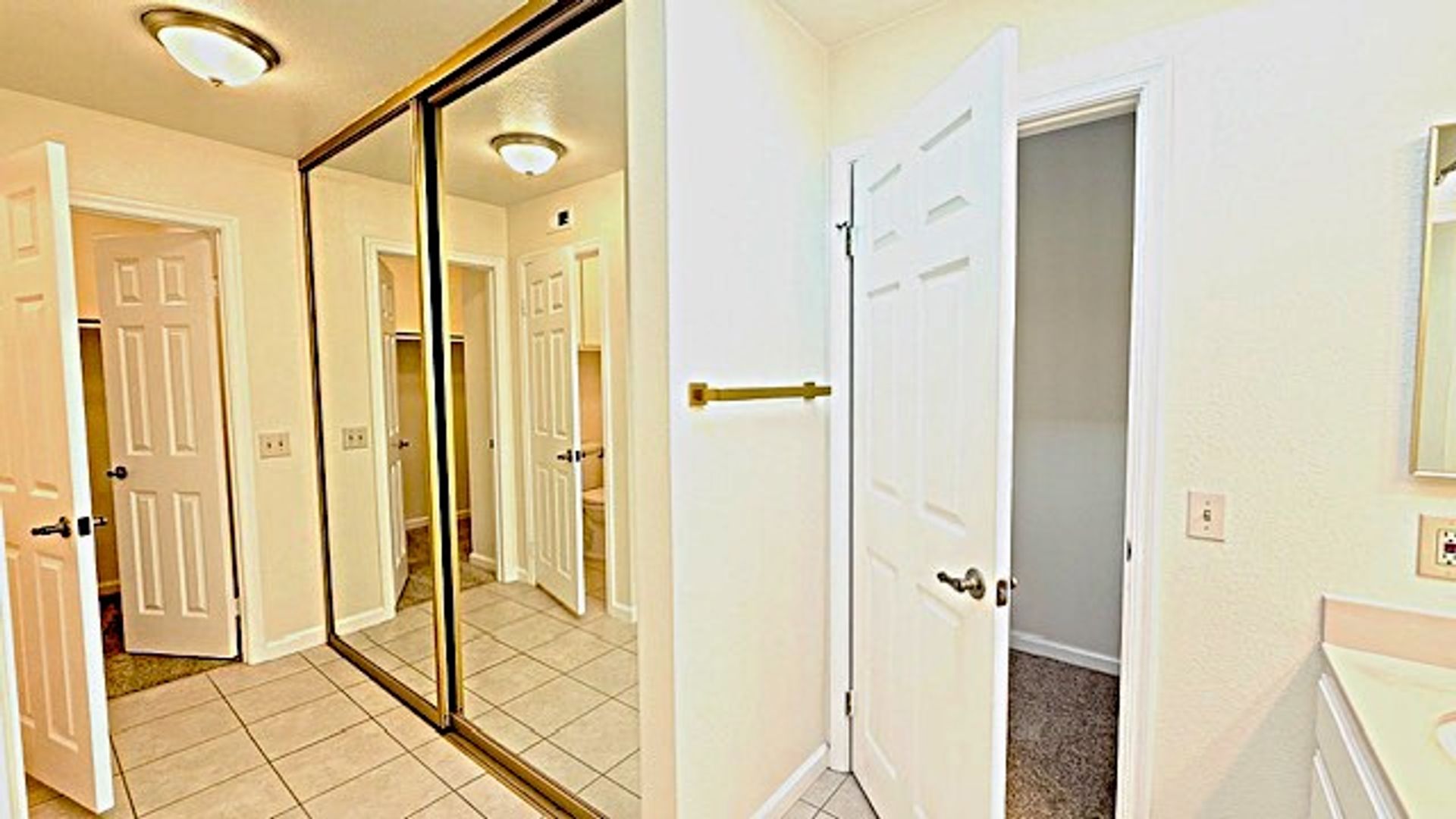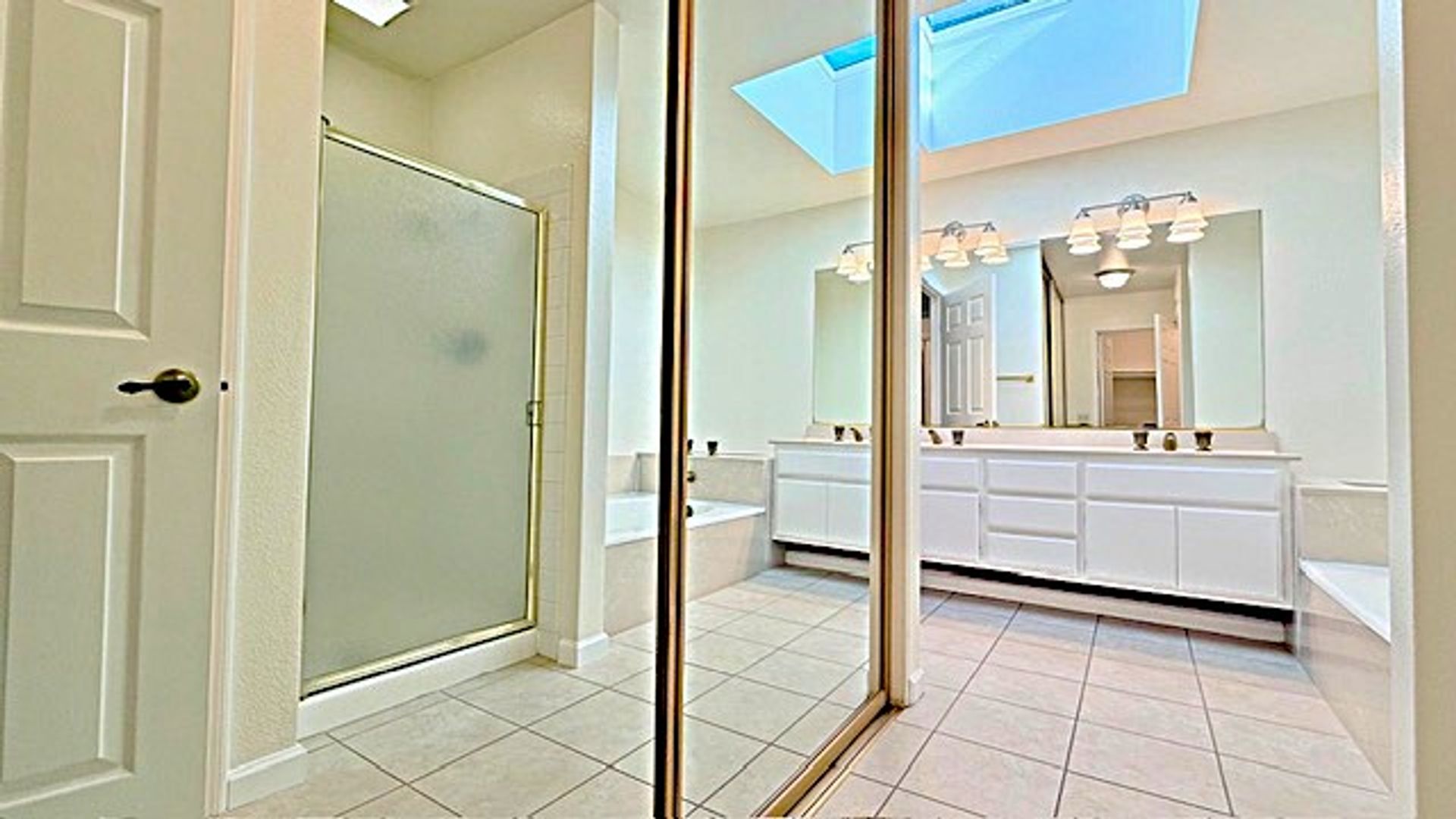 The spacious primary bedroom features vaulted ceilings, an en suite bathroom, and a slider that opens to the back patio with views of the golf course. The primary bathroom features a soaking tub, dual sink vanity with solid stone countertops and cabinetry, skylight, a walk-in closet and additional large mirror door closet, tile floors, a separate water closet, and a step-in shower. Bedroom #2 features a standard-sized closet, a window that overlooks the front courtyard and a private entry to the hall bath. The hall bath features tile floors, shower over tub, and single sink vanity with solid stone countertops, wall-to-wall vanity mirror, lower cabinets and a large vanity mirror.