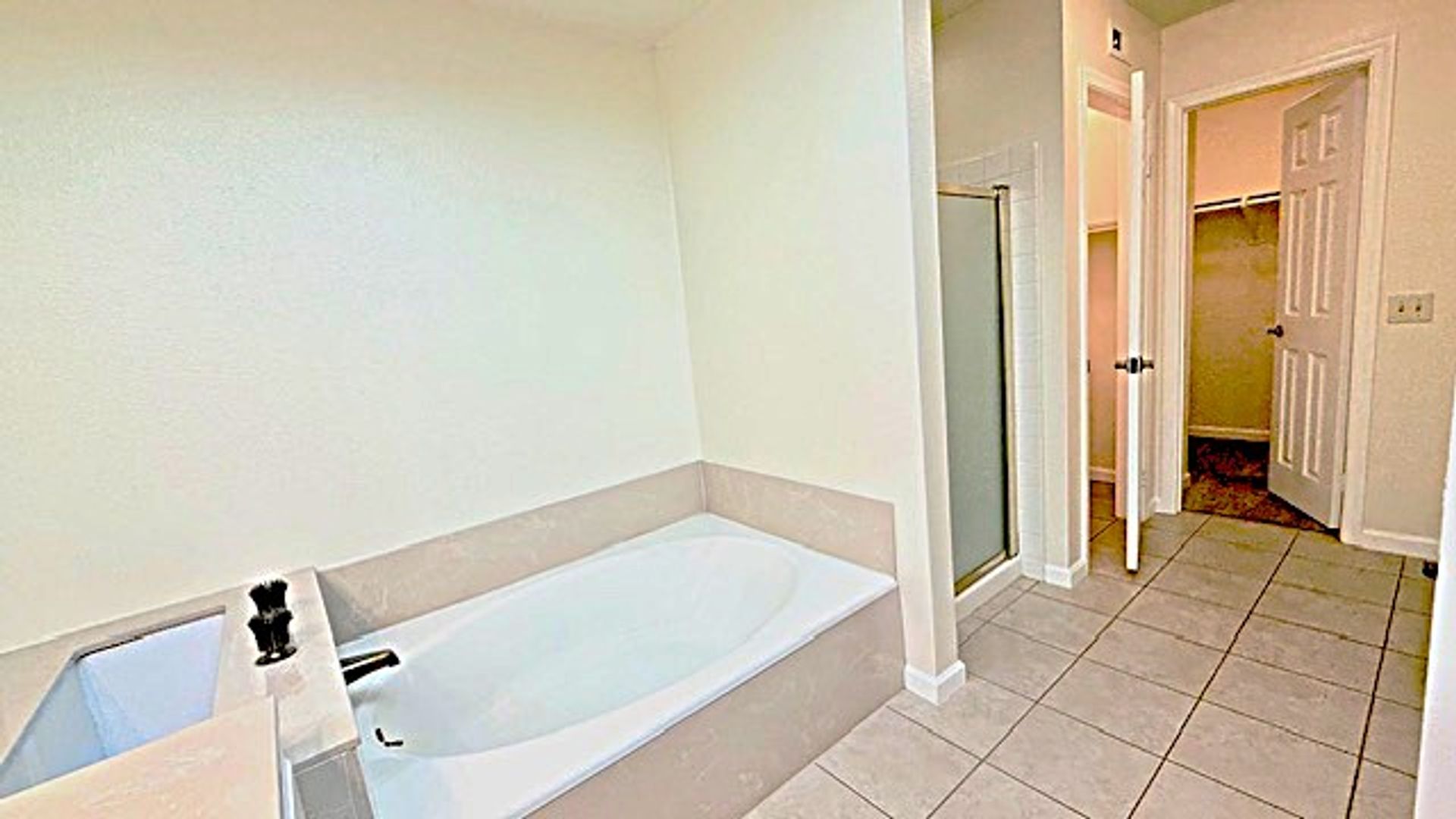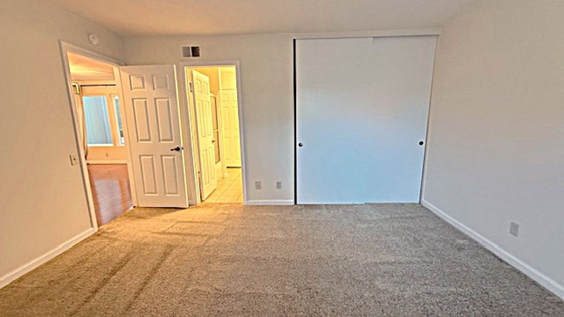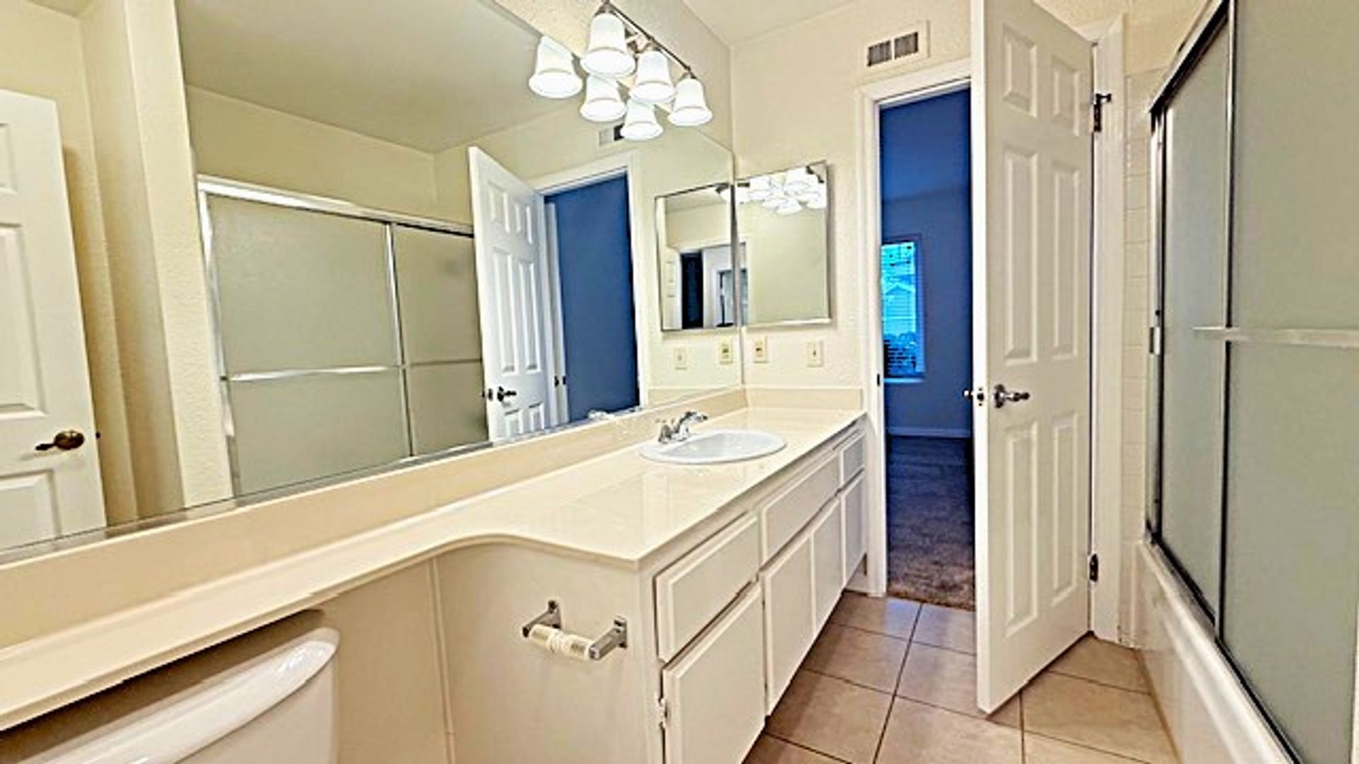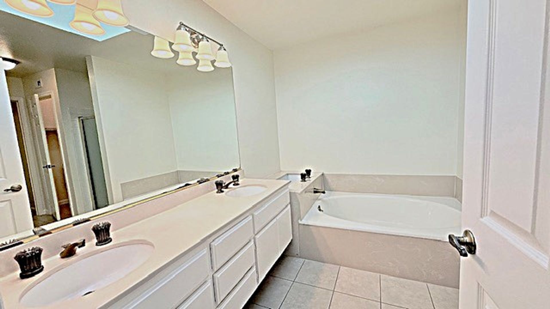 The spacious primary bedroom features vaulted ceilings, an en suite bathroom, and a slider that opens to the back patio with views of the golf course. The primary bathroom features a soaking tub, dual sink vanity with solid stone countertops and cabinetry, skylight, a walk-in closet and additional large mirror door closet, tile floors, a separate water closet, and a step-in shower. Bedroom #2 features a standard-sized closet, a window that overlooks the front courtyard and a private entry to the hall bath. The hall bath features tile floors, shower over tub, and single sink vanity with solid stone countertops, wall-to-wall vanity mirror, lower cabinets and a large vanity mirror.