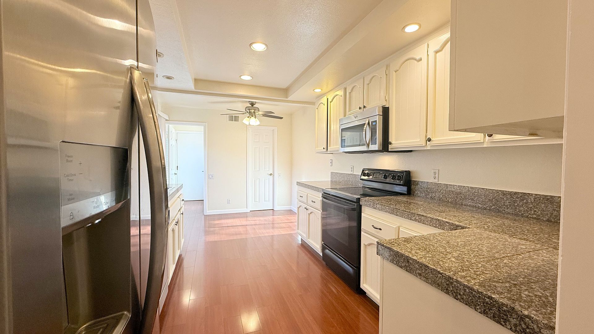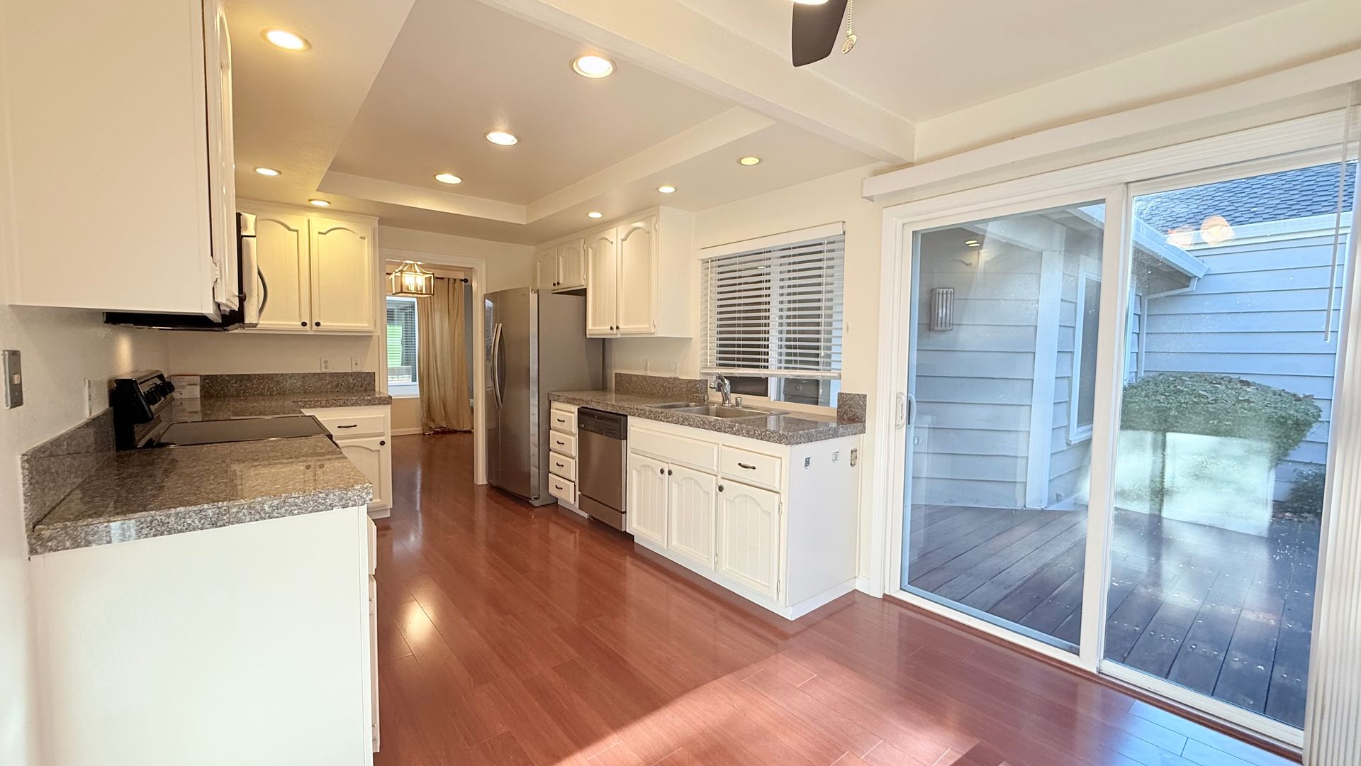 The recessed gated courtyard features a large private front deck entry. The front door entry opens to an inviting living space with gleaming laminate wood floors. The dining room overlooks the atrium and living room. The kitchen features granite tile countertops, full packaged stainless steel kitchen appliances (electric smooth top range/oven, microwave, refrigerator, and dishwasher), double-bowl sink with pullout faucet and window that overlooks the courtyard ample cabinetry, and adjoining breakfast nook with skylight, pantry and a slider to the courtyard deck. The expansive living room features a decorative fireplace with brick surround, vaulted ceilings, and a large slider that leads to the large back patio with amazing views of the fairway.