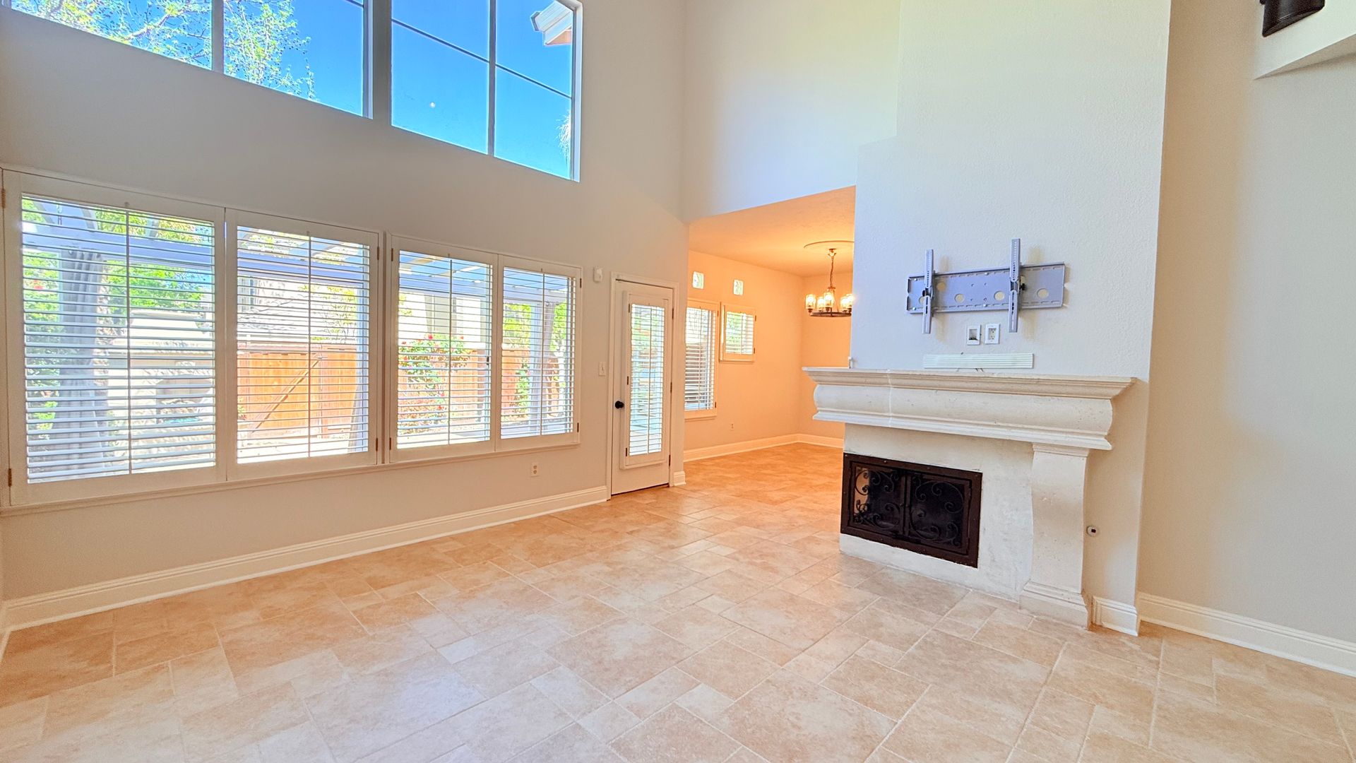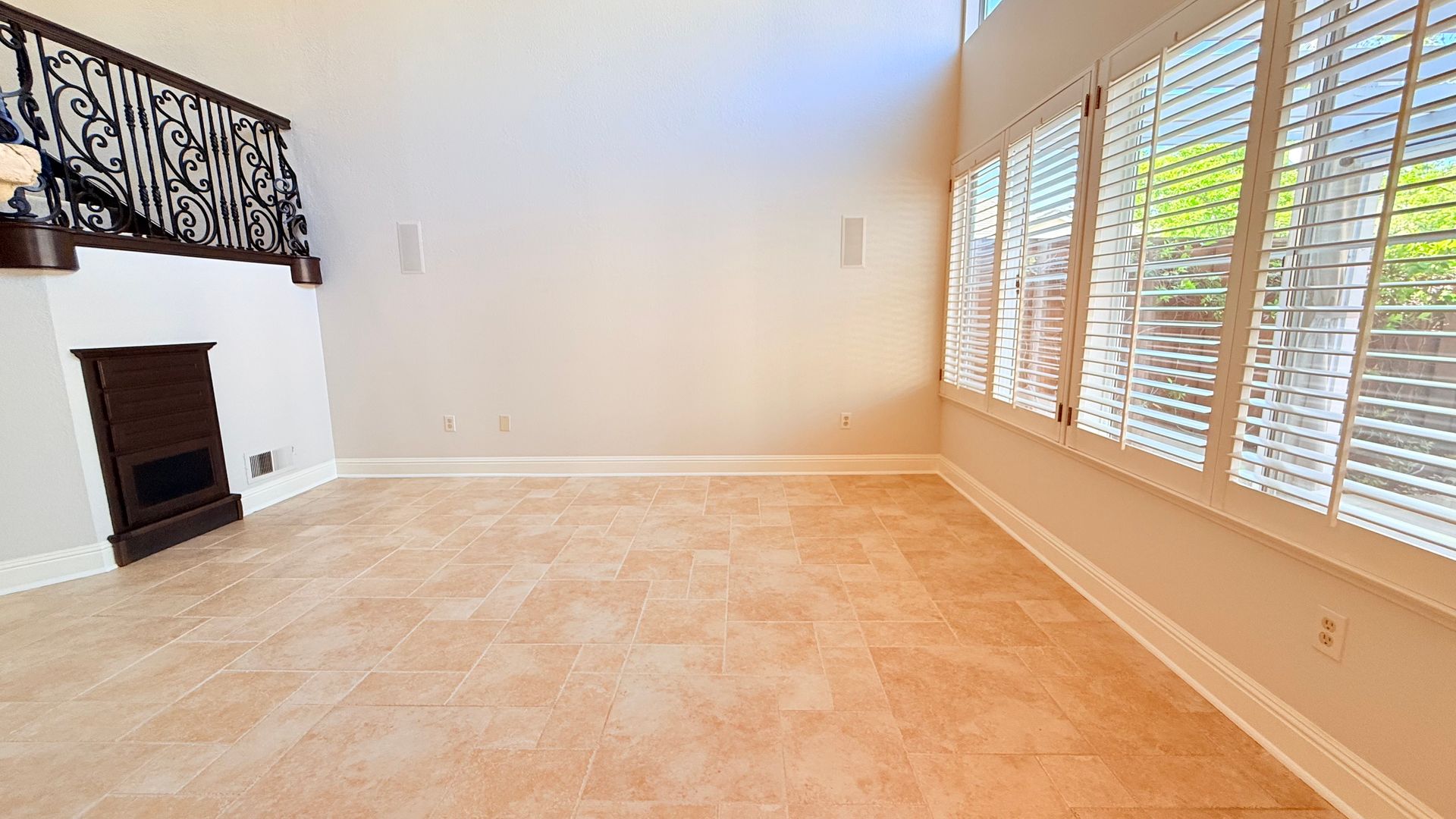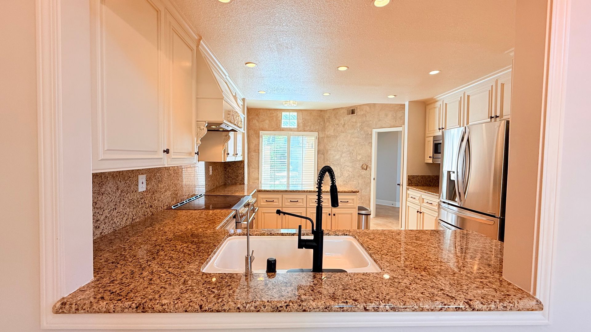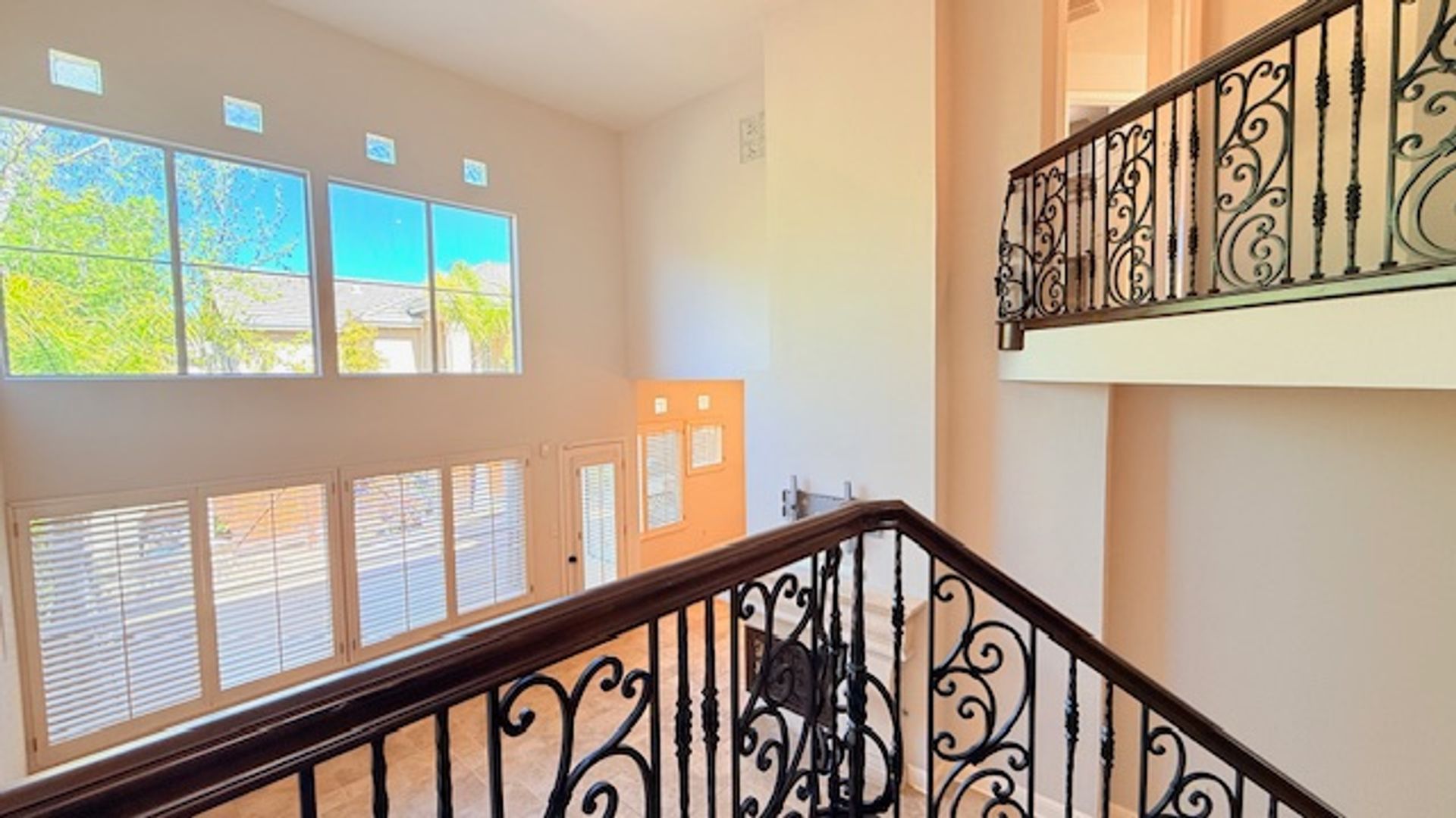 The front door entry opens to an elegant foyer with vaulted ceilings and a gorgeous, sweeping staircase. The bright and airy living room features a gas fireplace, custom-built audio/video cabinet, view of the elegant and ornate wrought iron stairs and upstairs banisters, a wall of windows and a glass door that leads to the beautiful backyard patio. The gourmet kitchen features granite countertops, full-packaged stainless steel appliances (induction stove/oven, French door refrigerator, and dishwasher), microwave, deep single-bowl sink with antique bronze single-lever goose-neck pullout faucet, filtered water faucet, ample cabinetry, and an adjoining breakfast nook area with views of the front courtyard. The adjacent dining area features an elegant chandelier and ample windows overlooking the back patio. The laundry room features full-sized washer/dryer and cabinets. The powder room features a single-sink vanity with solid stone countertops.