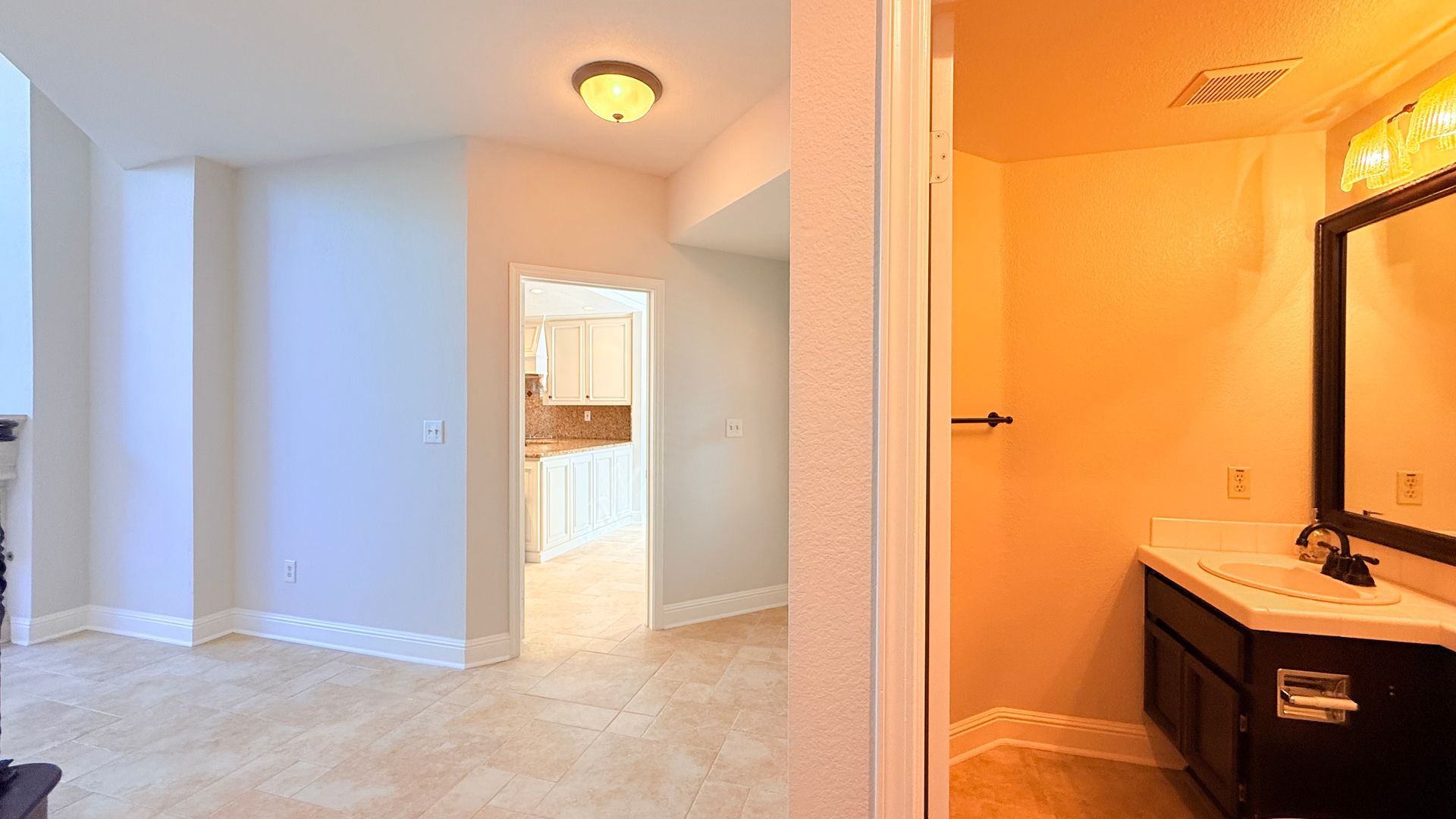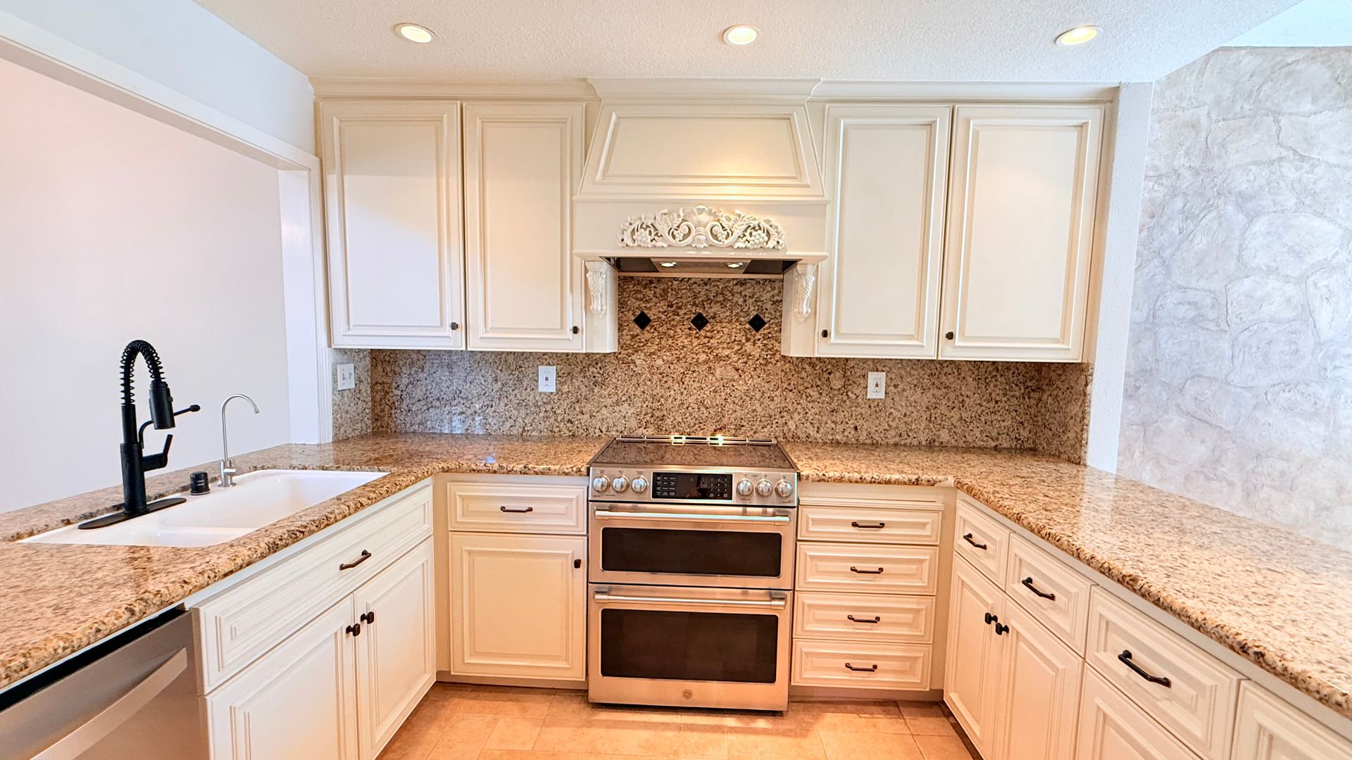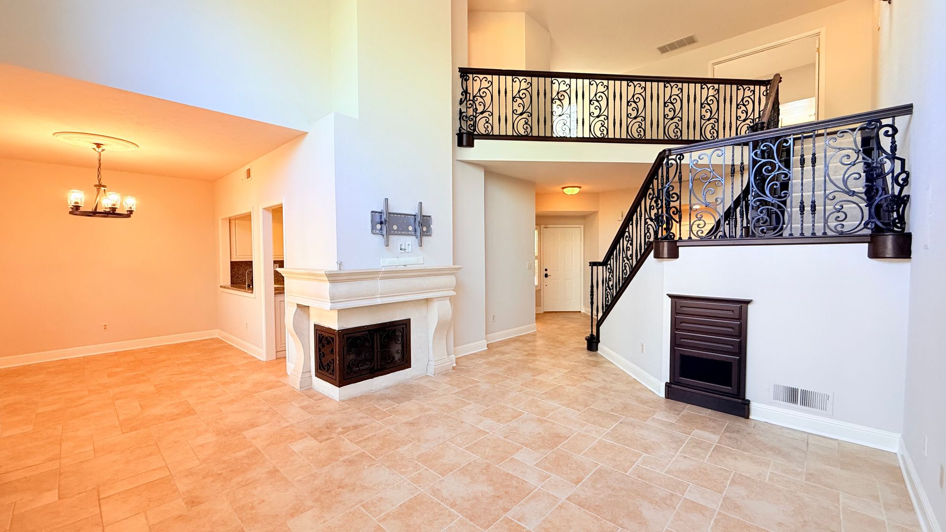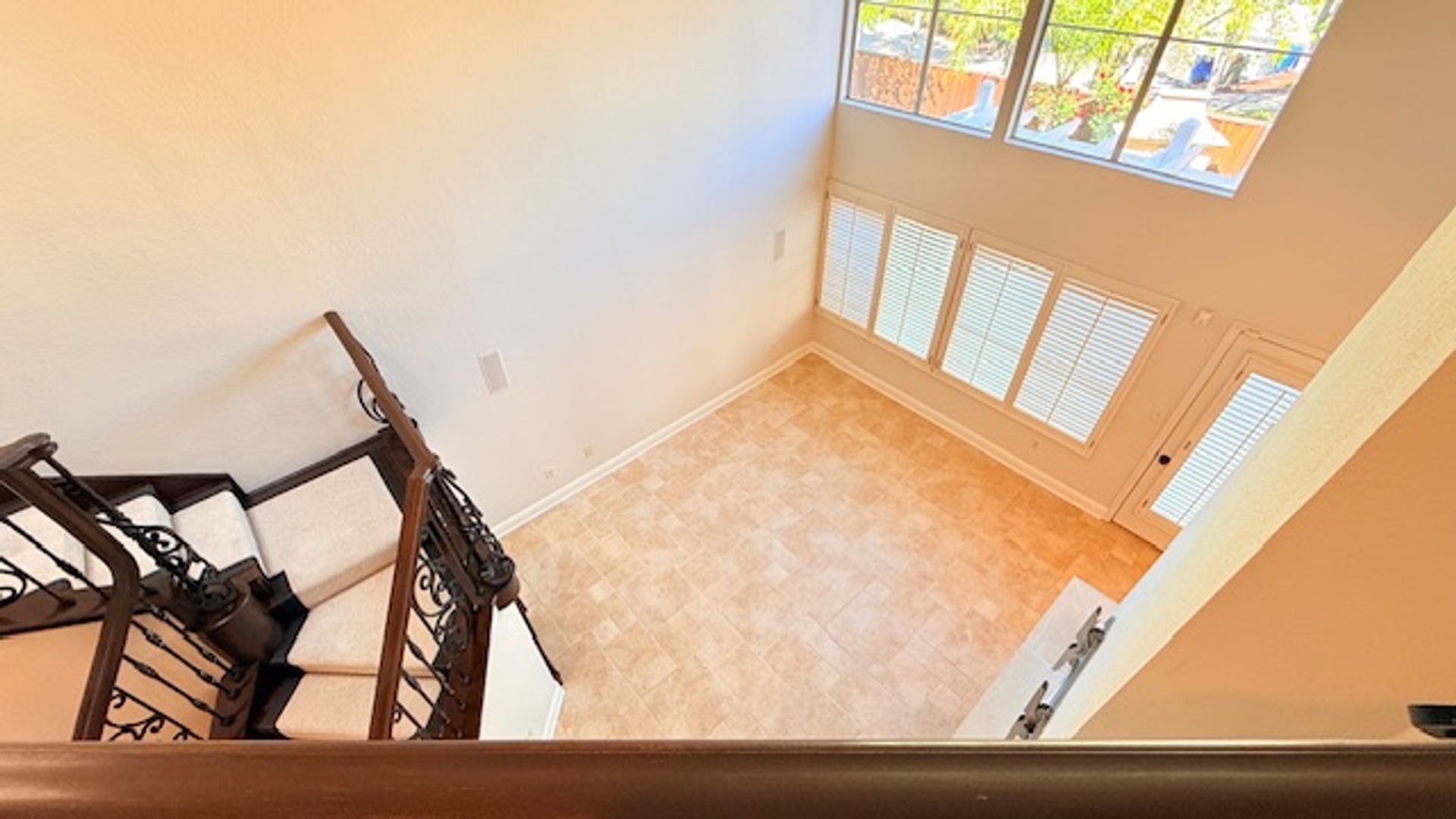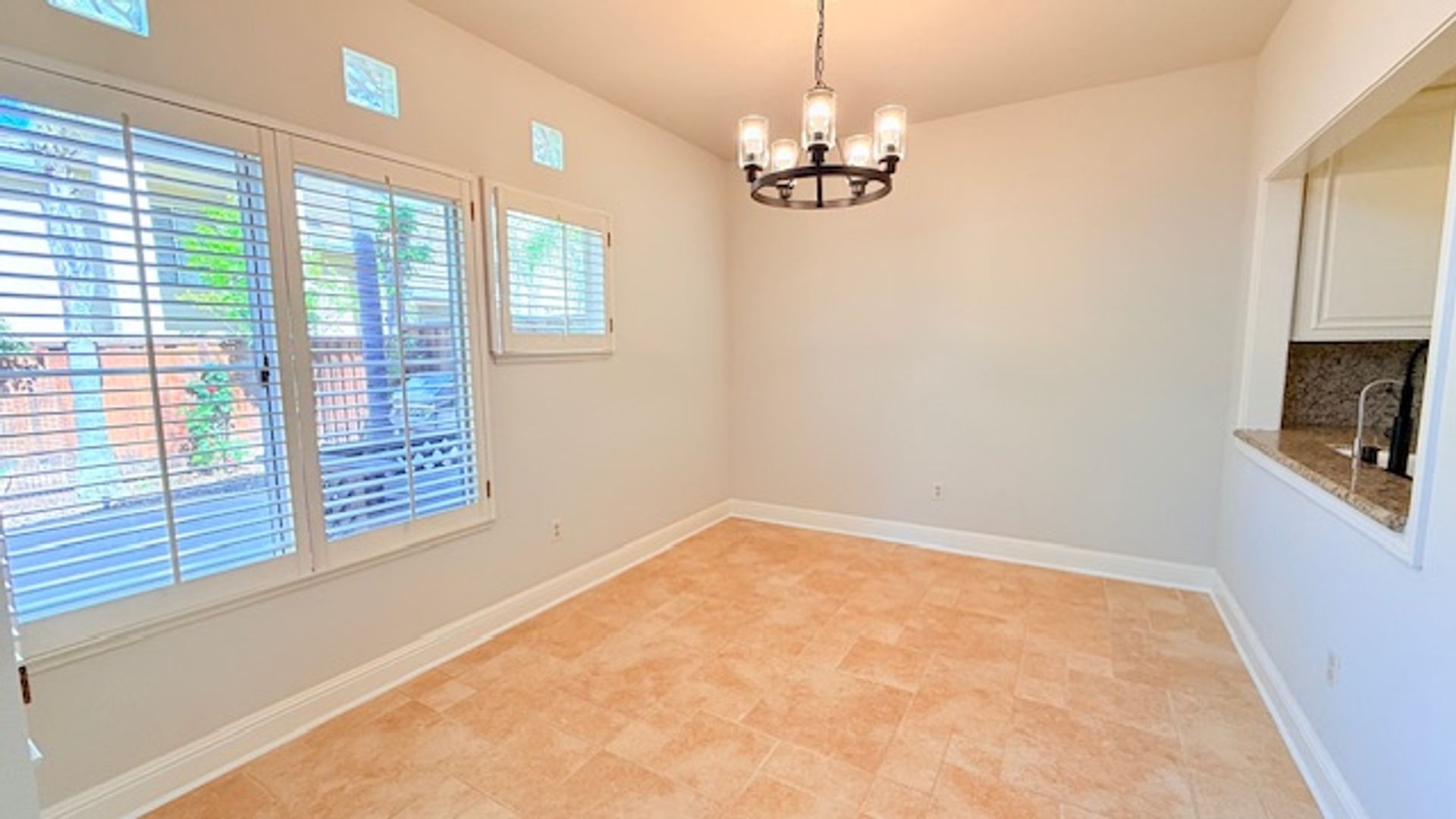 The front door entry opens to an elegant foyer with vaulted ceilings and a gorgeous, sweeping staircase. The bright and airy living room features a gas fireplace, custom-built audio/video cabinet, view of the elegant and ornate wrought iron stairs and upstairs banisters, a wall of windows and a glass door that leads to the beautiful backyard patio. The gourmet kitchen features granite countertops, full-packaged stainless steel appliances (induction stove/oven, French door refrigerator, and dishwasher), microwave, deep single-bowl sink with antique bronze single-lever goose-neck pullout faucet, filtered water faucet, ample cabinetry, and an adjoining breakfast nook area with views of the front courtyard. The adjacent dining area features an elegant chandelier and ample windows overlooking the back patio. The laundry room features full-sized washer/dryer and cabinets. The powder room features a single-sink vanity with solid stone countertops.