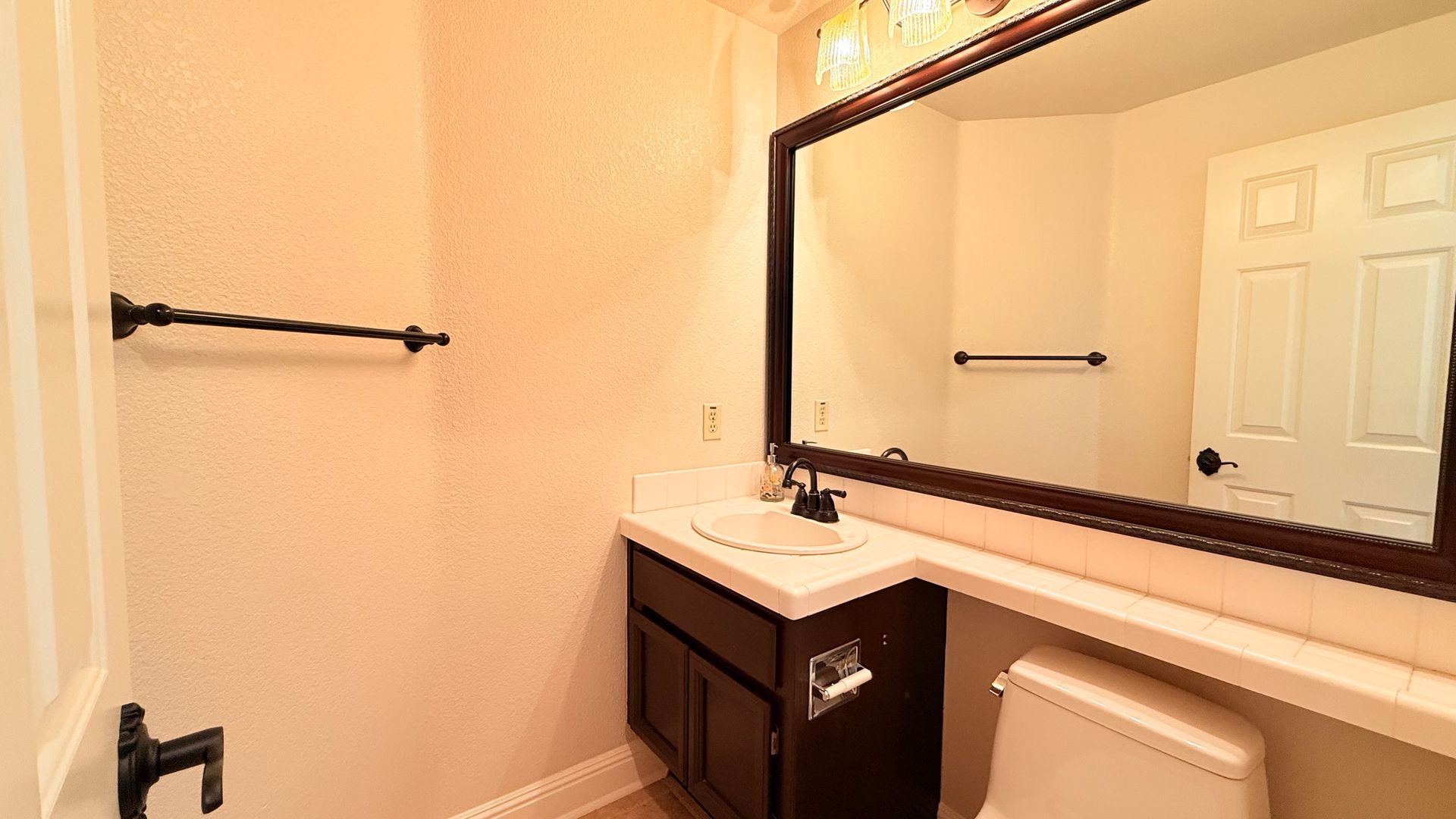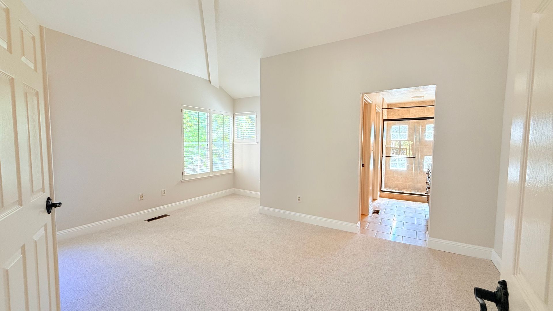 The spacious loft features a large, custom-built shelving unit and astonishing view of the living room below. The spacious primary bedroom features high ceilings with exposed wood beam, an en suite bathroom, and view of the backyard. The primary bathroom features a walk-in closet, dual sink vanity with beautiful granite countertops, vanity light fixtures, soaking tub, step-in shower with clear glass enclosure, tile surround, antique bronze faucets and shower, and a separate water closet. The second bedroom features double door entry and an en suite bathroom with single-sink vanity, step-in shower, walk-in closet and separate water closet.