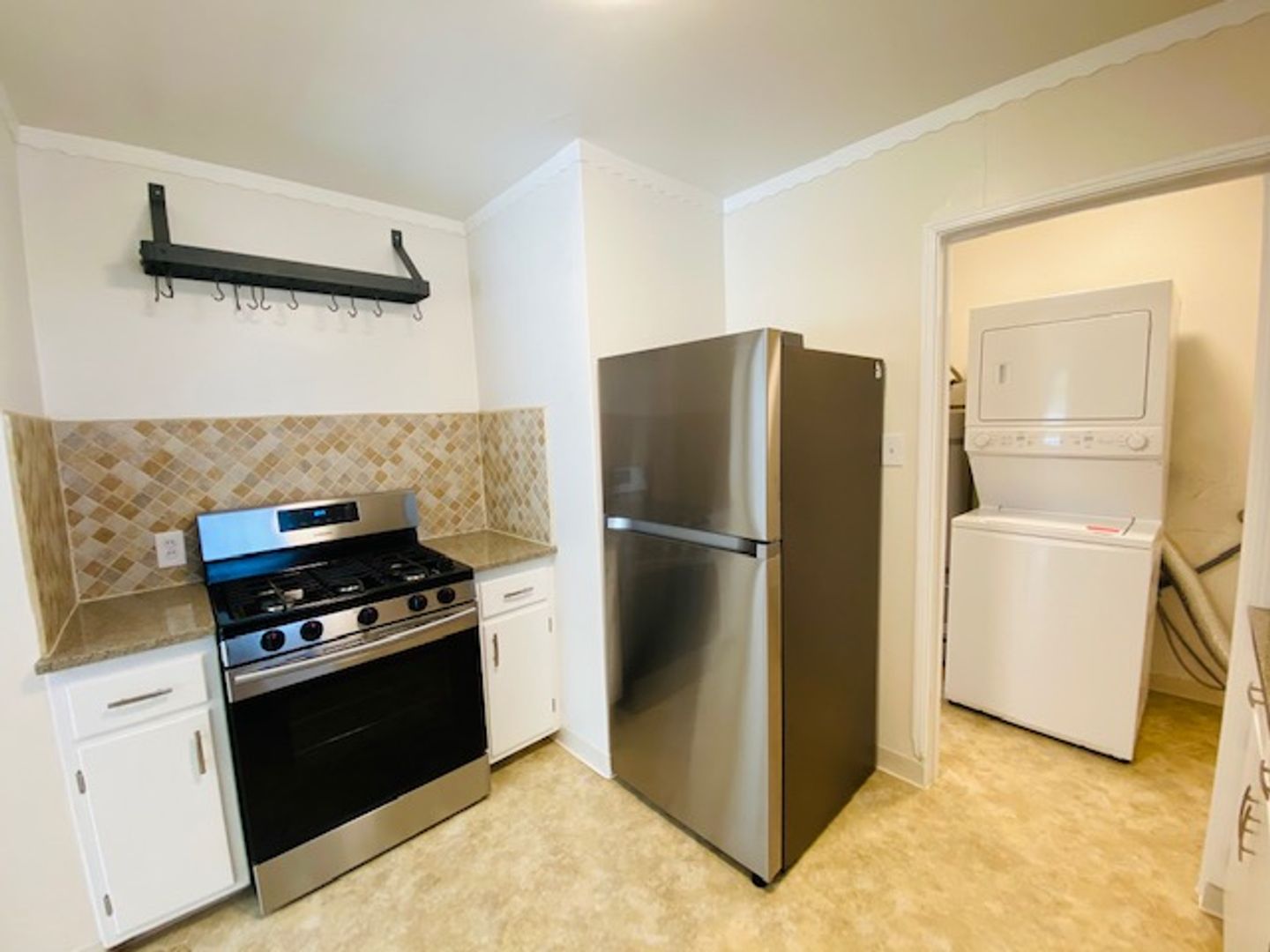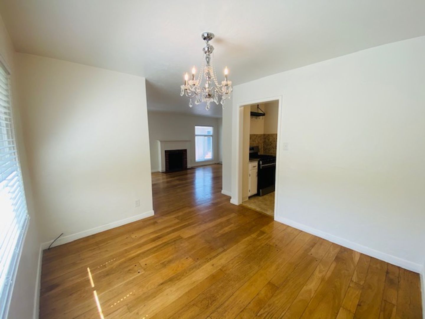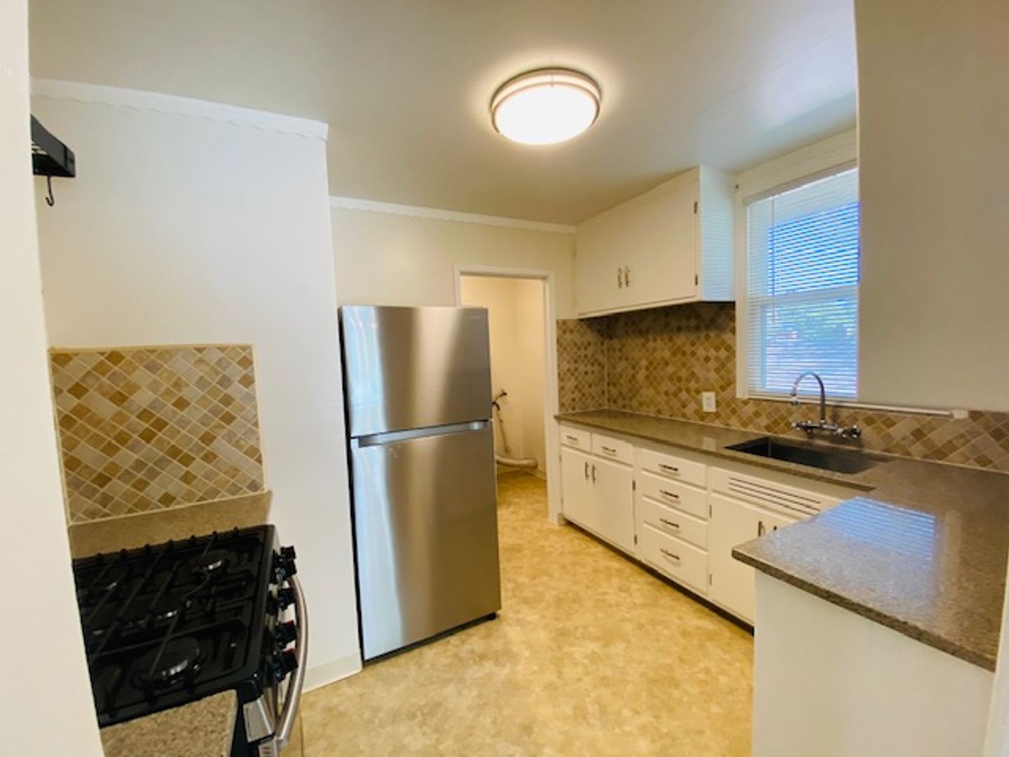 The home features a decorative fireplace, hardwood floors throughout, walk-in coat/storage closet, and large windows for natural lighting. The dining area features an elegant chandelier and a large window that overlooks the front yard. The kitchen features granite countertops, a five (5) burner gas range, stainless steel refrigerator, a single-bowl sink with old-fashioned style faucet, and ample cabinetry. No dishwasher and no garbage disposal. The spacious bedroom has a large-sized closet with a built-in 5-drawer dresser and lighted ceiling fan. The bathroom features tiled single sink vanity, soaking tub and a separate step-in shower. Laundry room is located off the kitchen with stackable washer/dryer unit. Central heat. No A/C. Oversized 1 car detached garage.