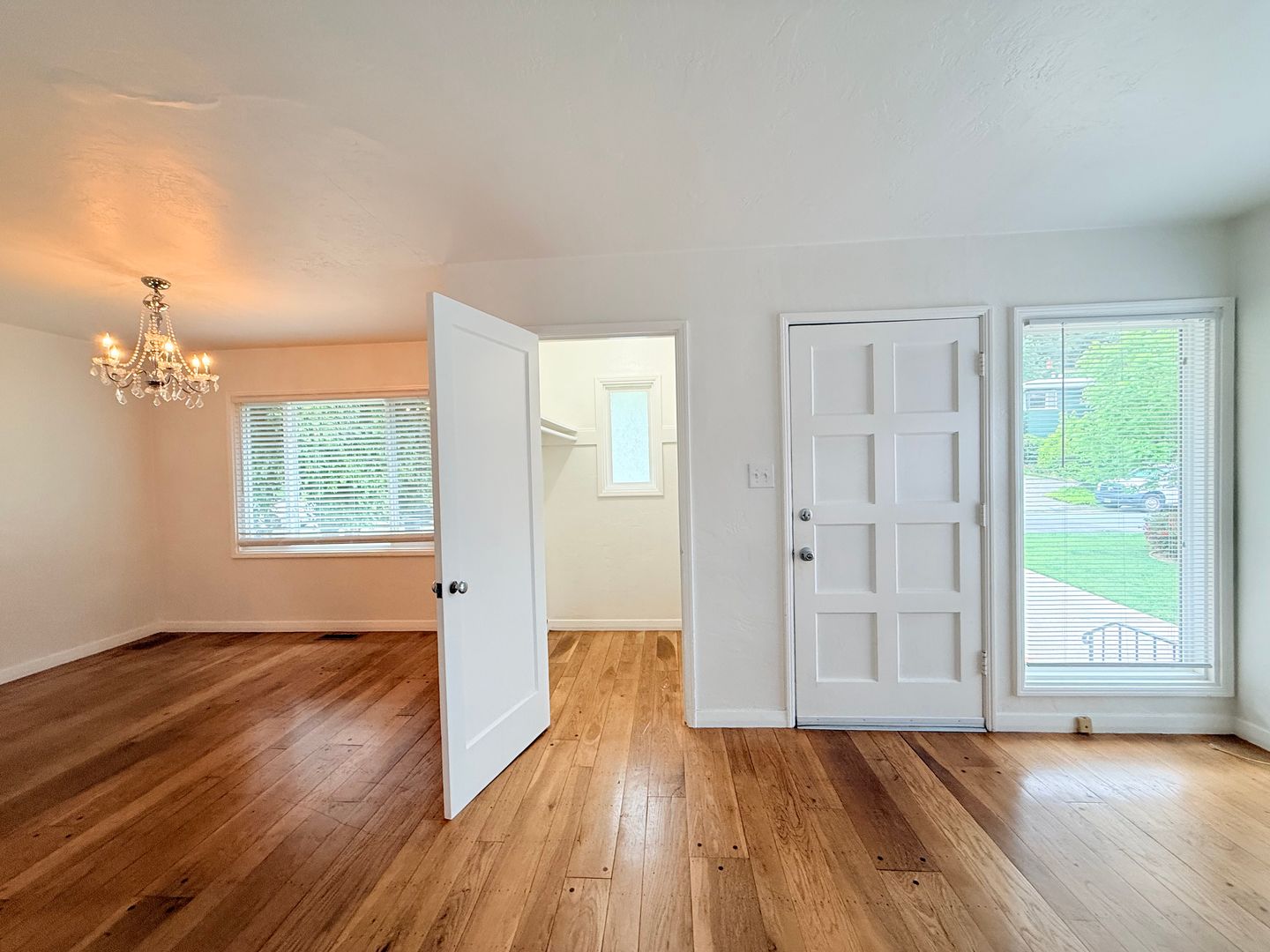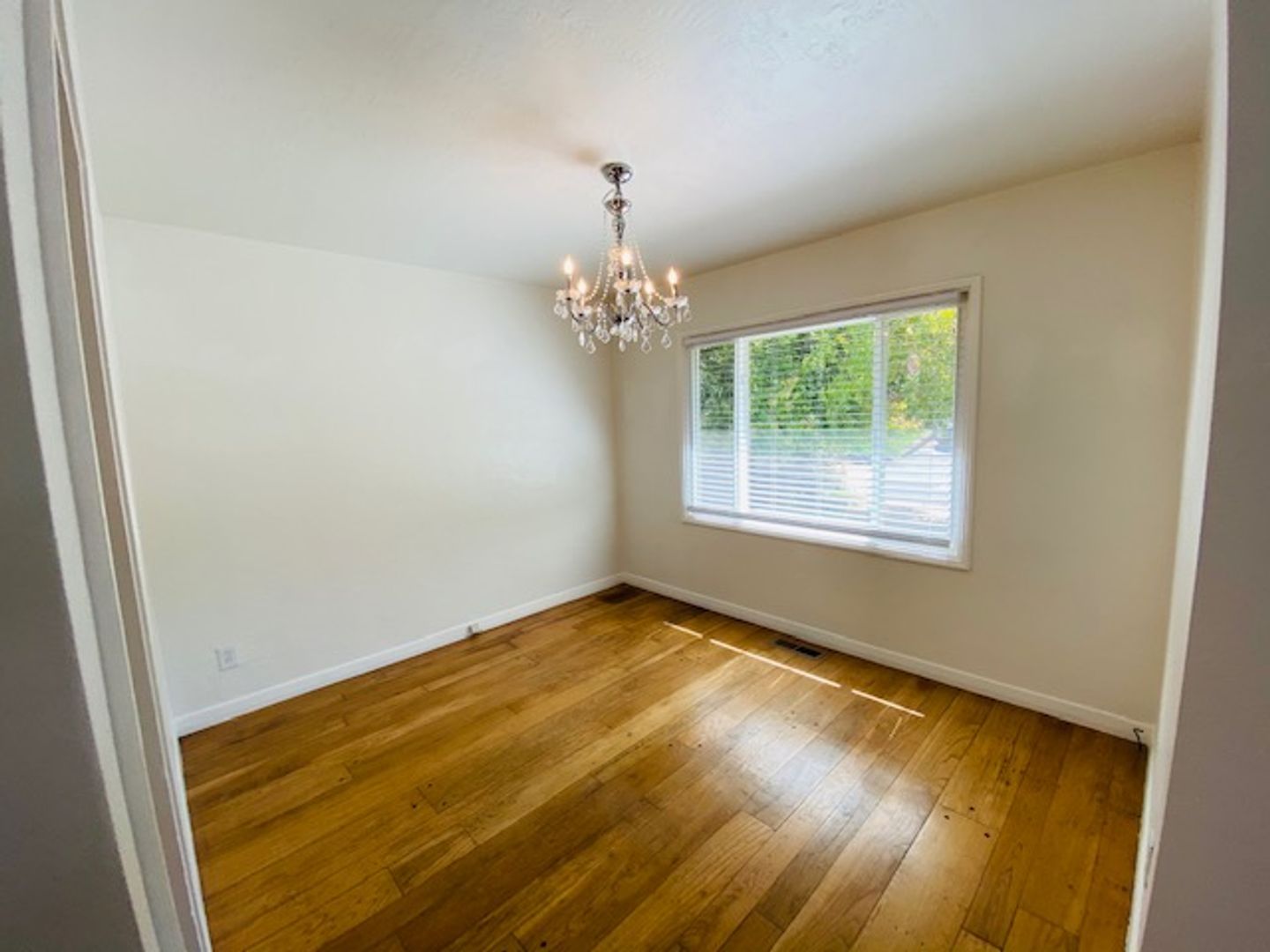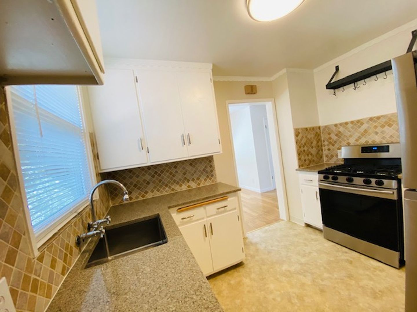 The home features a decorative fireplace, hardwood floors throughout, walk-in coat/storage closet, and large windows for natural lighting. The dining area features an elegant chandelier and a large window that overlooks the front yard. The kitchen features granite countertops, a five (5) burner gas range, stainless steel refrigerator, a single-bowl sink with old-fashioned style faucet, and ample cabinetry. No dishwasher and no garbage disposal. The spacious bedroom has a large-sized closet with a built-in 5-drawer dresser and lighted ceiling fan. The bathroom features tiled single sink vanity, soaking tub and a separate step-in shower. Laundry room is located off the kitchen with stackable washer/dryer unit. Central heat. No A/C. Oversized 1 car detached garage.