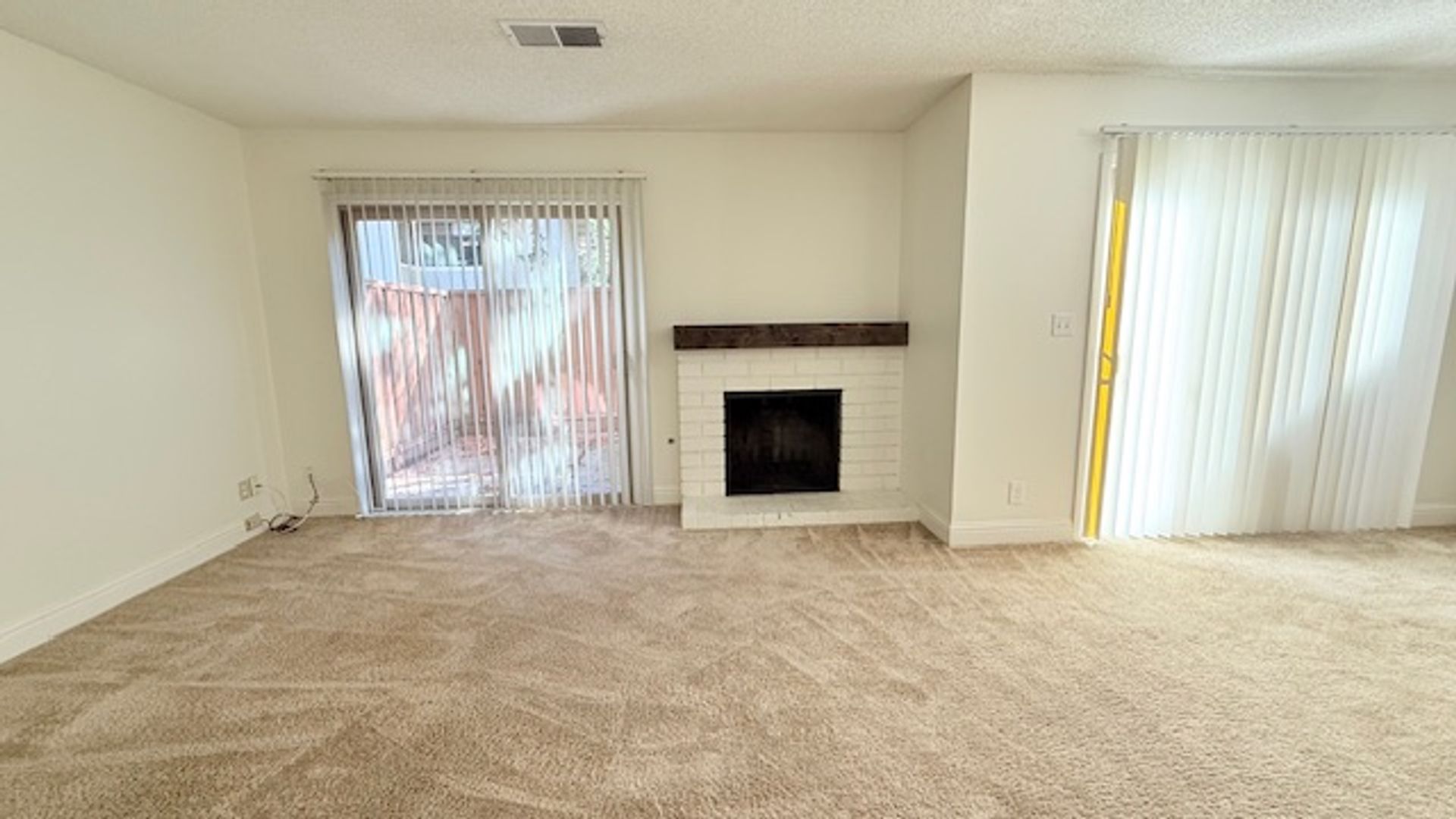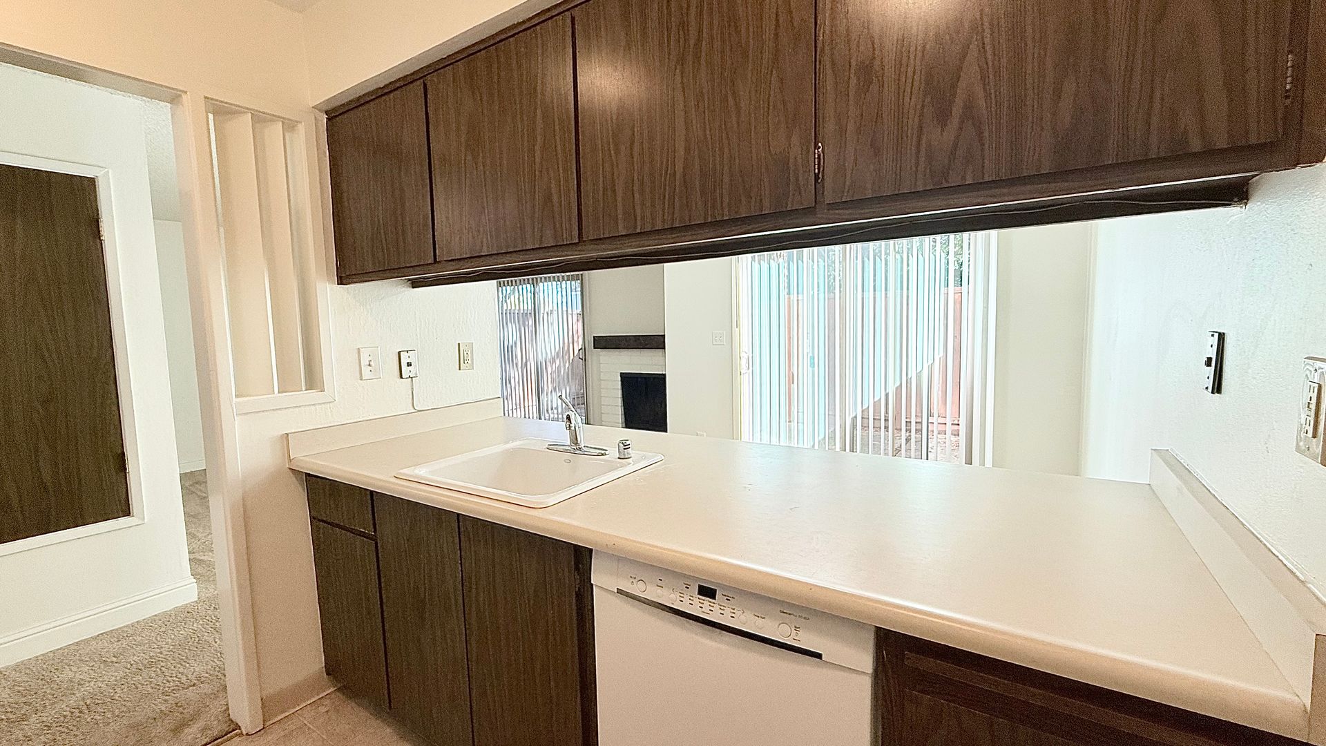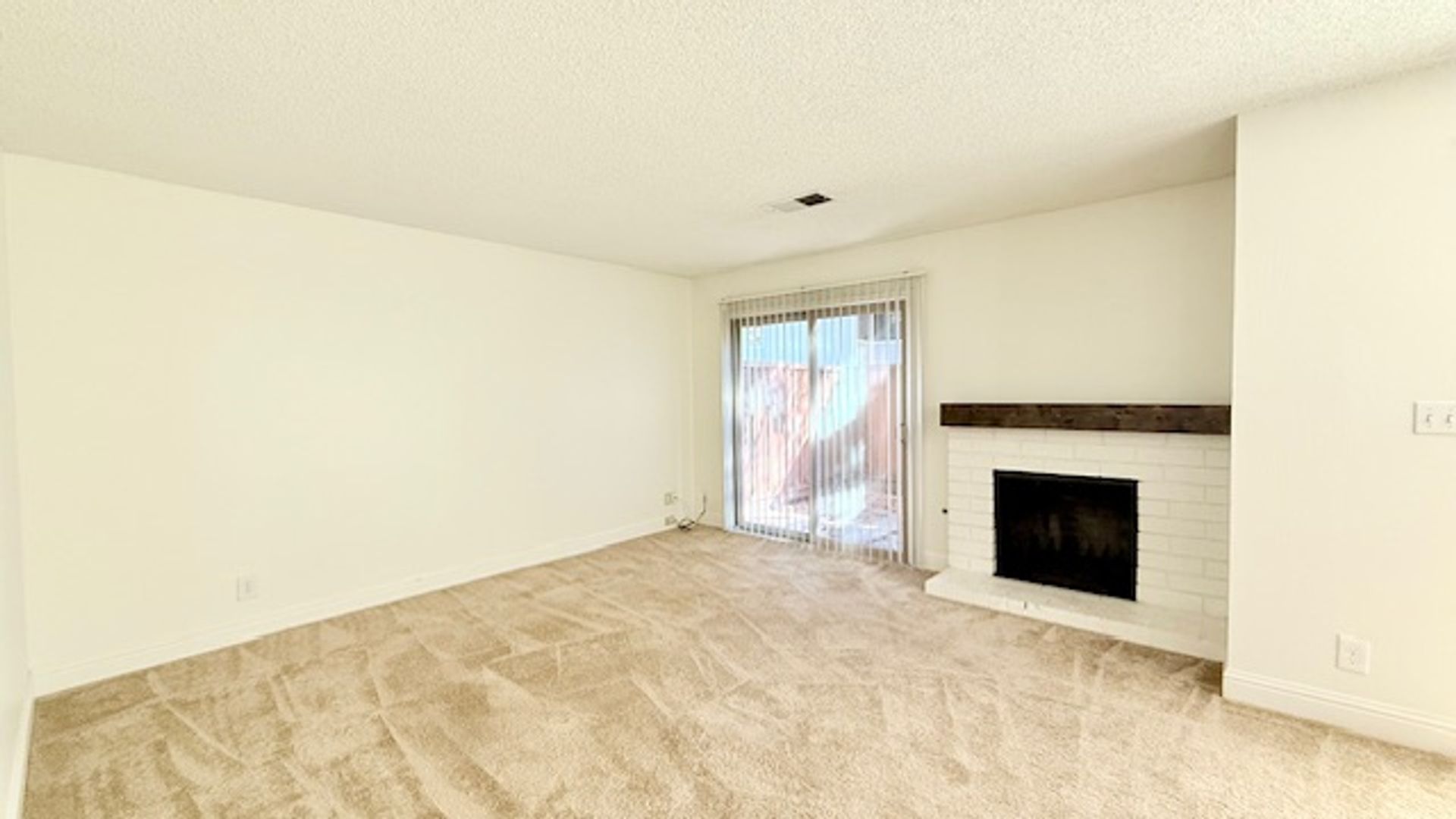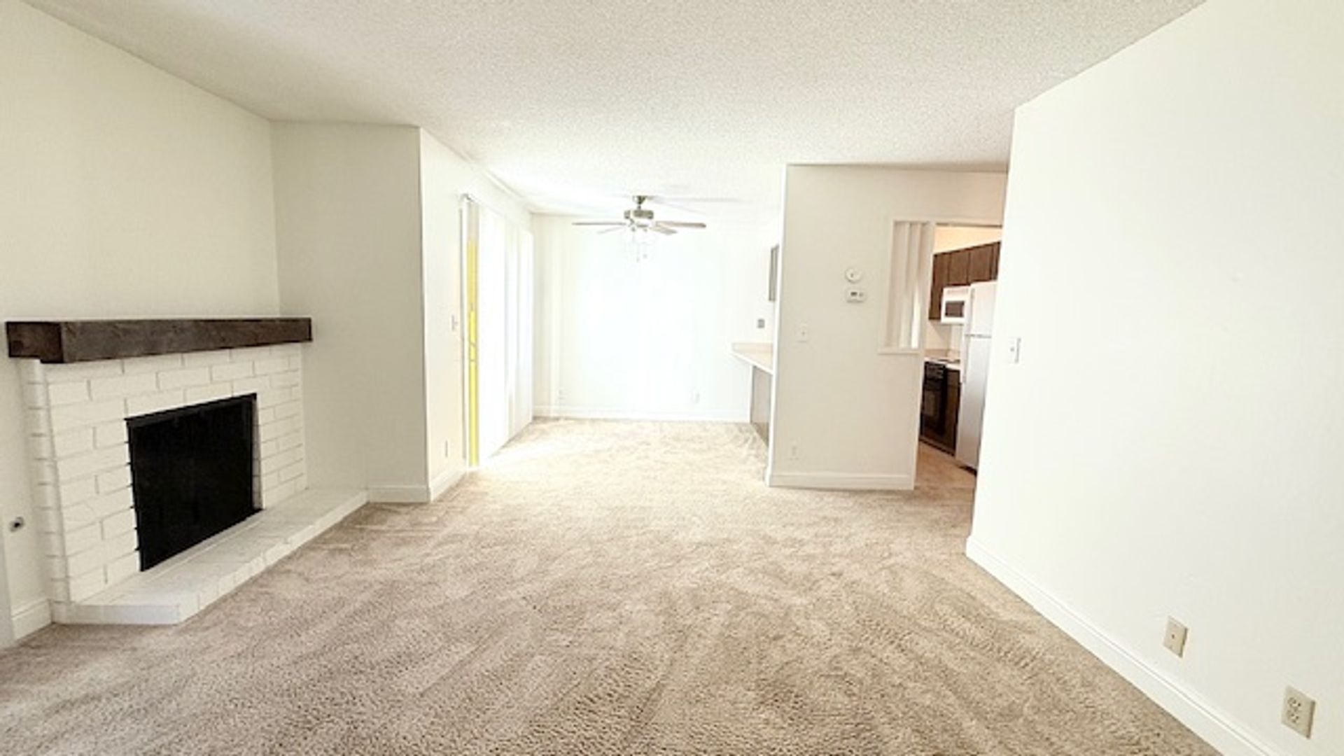 The front door entry opens to an open space living area. The half bath/powder room features a single sink vanity with solid stone countertops and storage closet with bi-fold accordion doors. The kitchen features an electric cooktop/oven, dishwasher, refrigerator, single-bowl sink with pullout faucet, garbage disposal, ample cabinetry, and countertop for additional seating/eating and workspace area. The living room features a decorative only fireplace with brick surround a slider to the back patio. The adjoining dining area features another slider to the back patio.