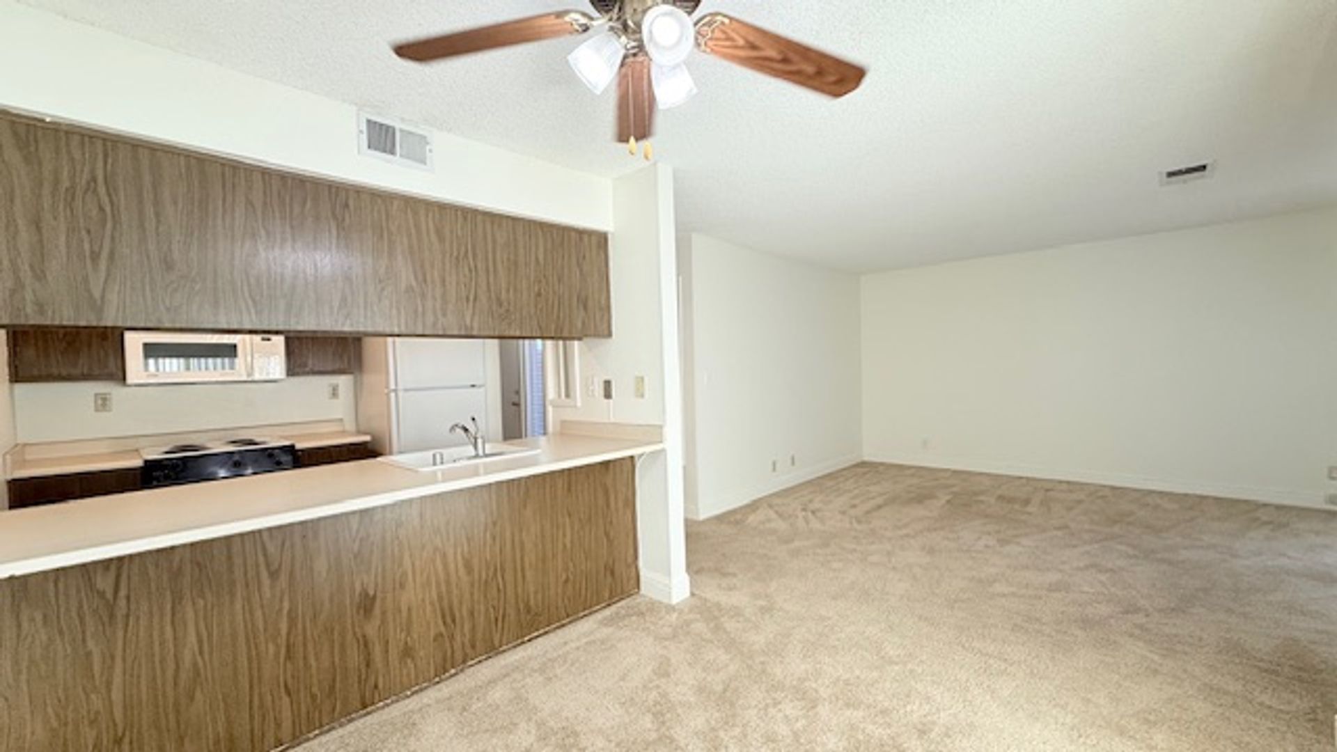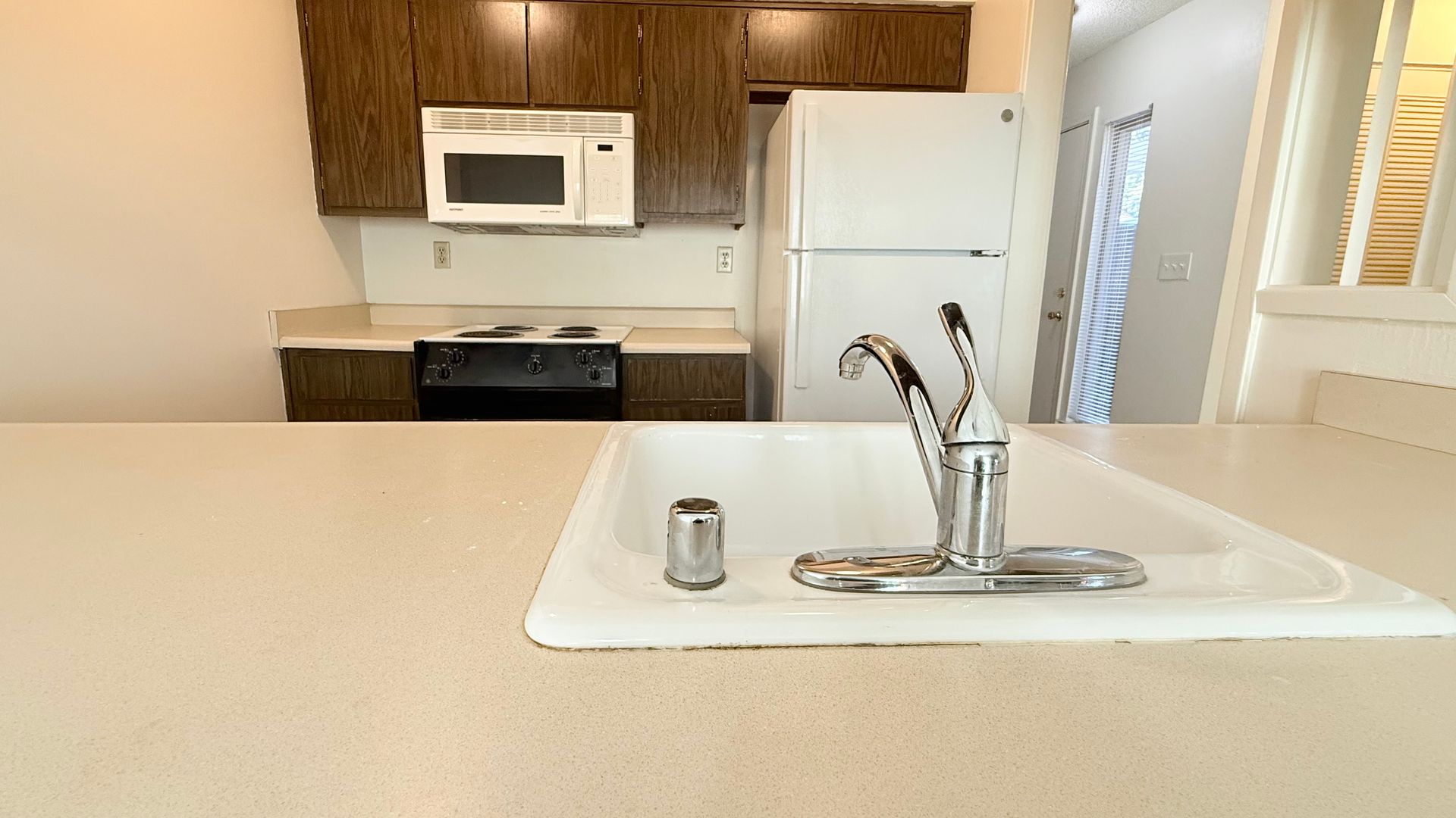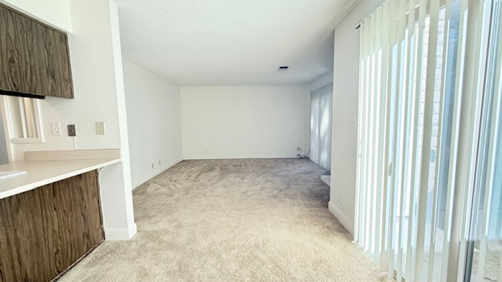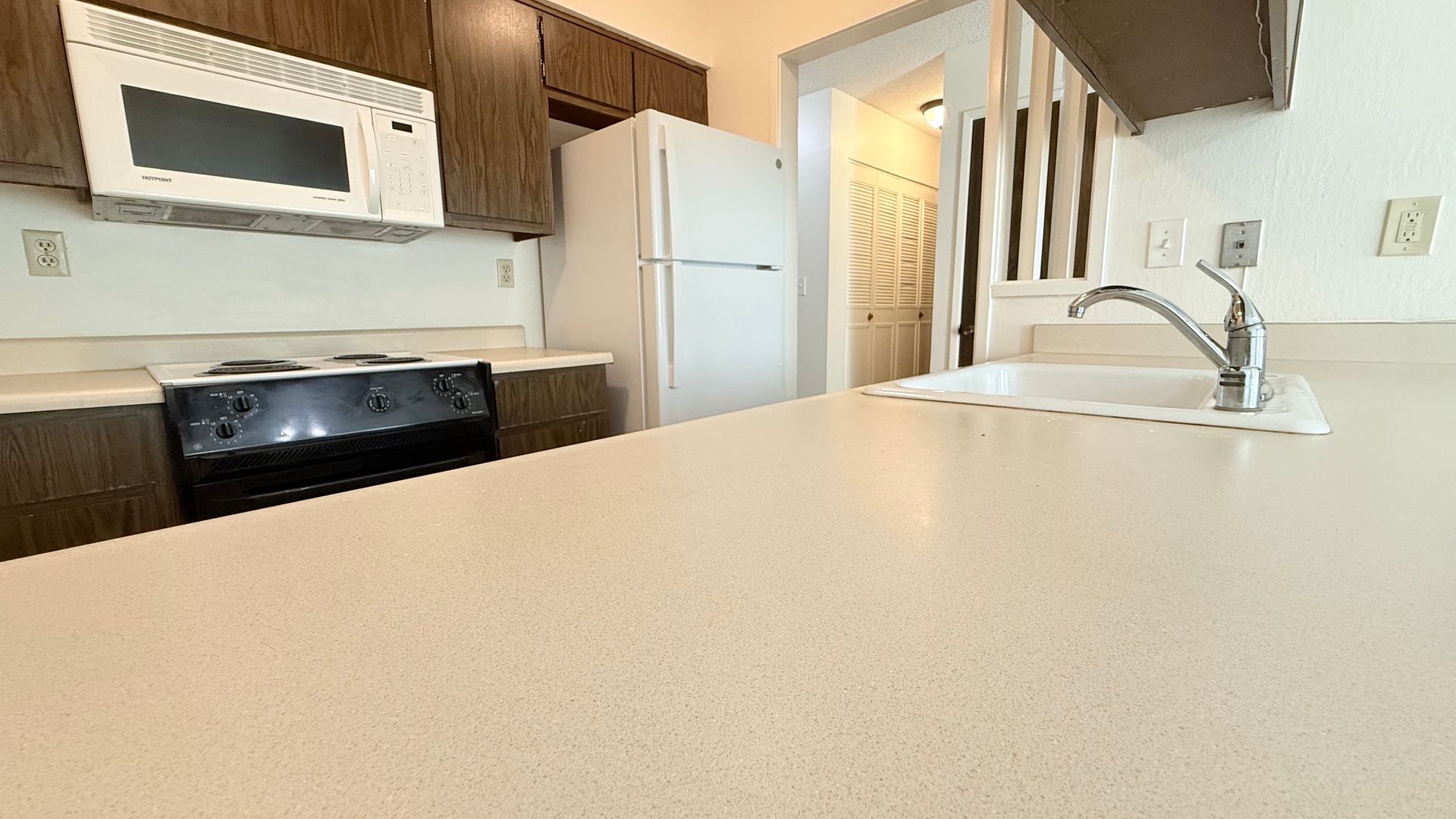 The front door entry opens to an open space living area. The half bath/powder room features a single sink vanity with solid stone countertops and storage closet with bi-fold accordion doors. The kitchen features an electric cooktop/oven, dishwasher, refrigerator, single-bowl sink with pullout faucet, garbage disposal, ample cabinetry, and countertop for additional seating/eating and workspace area. The living room features a decorative only fireplace with brick surround a slider to the back patio. The adjoining dining area features another slider to the back patio.