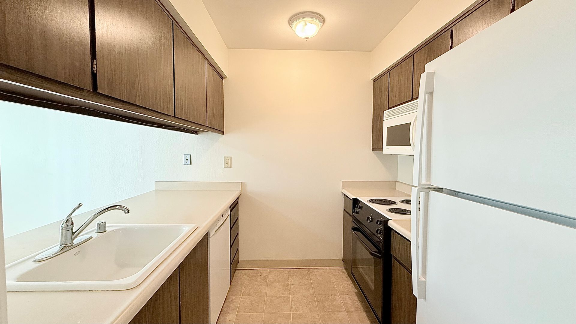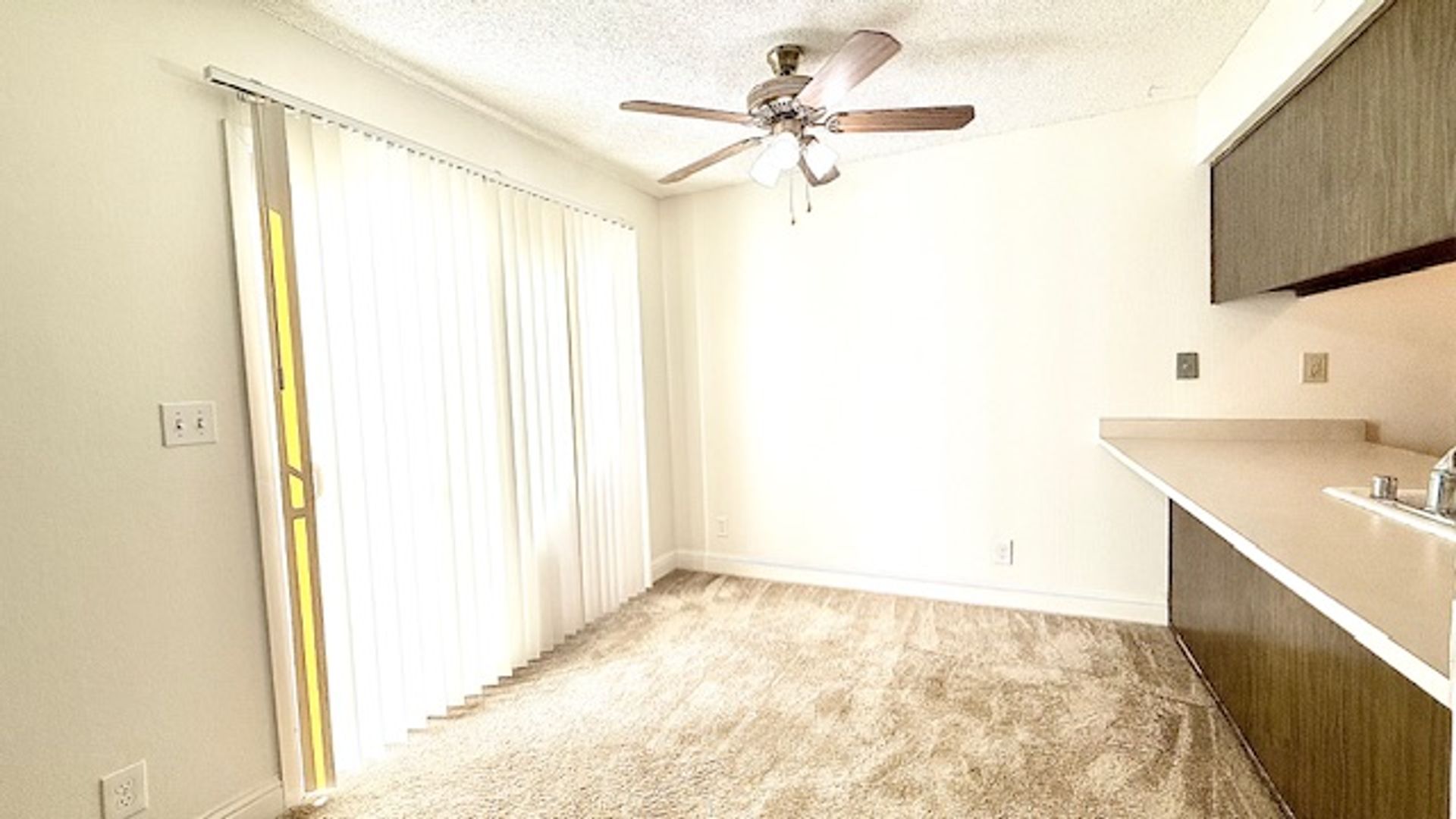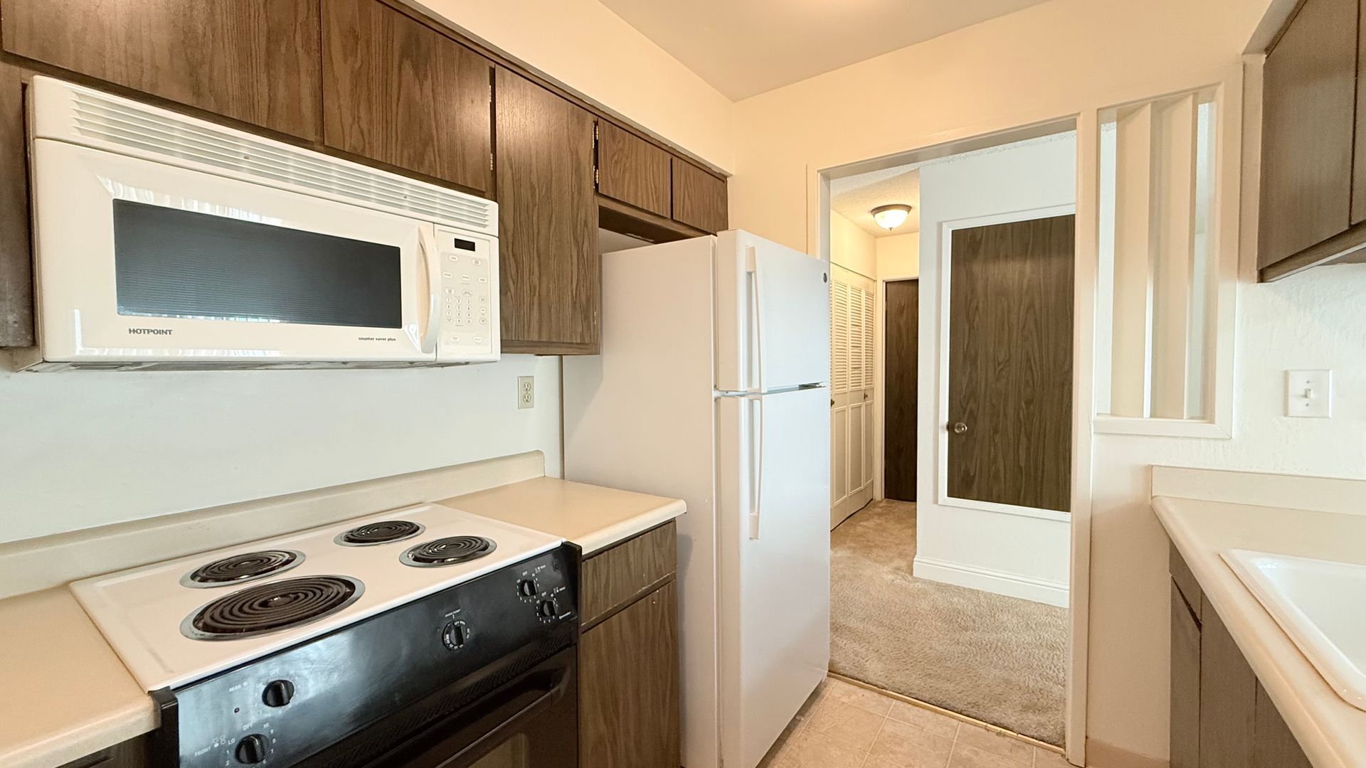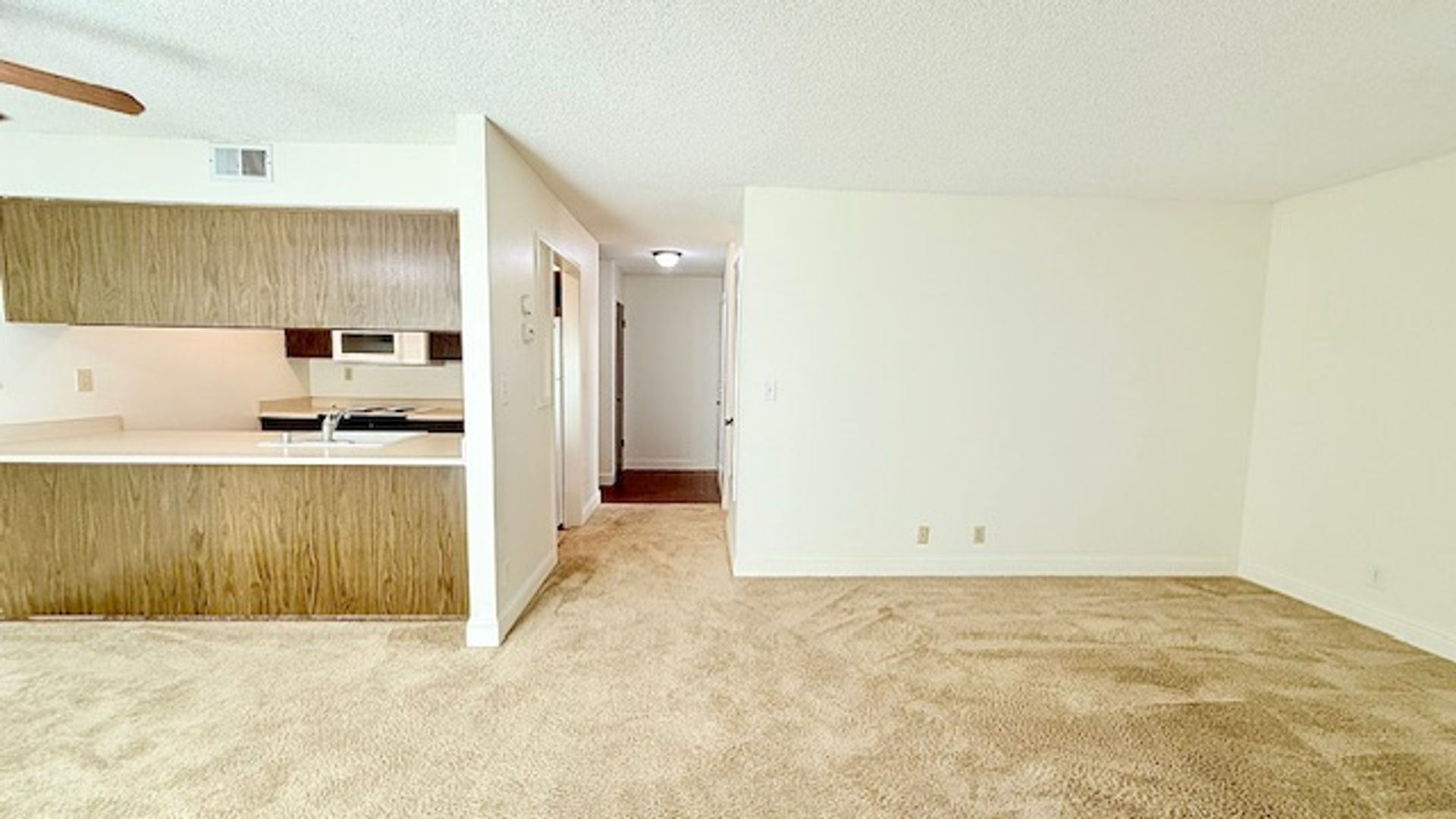 The front door entry opens to an open space living area. The half bath/powder room features a single sink vanity with solid stone countertops and storage closet with bi-fold accordion doors. The kitchen features an electric cooktop/oven, dishwasher, refrigerator, single-bowl sink with pullout faucet, garbage disposal, ample cabinetry, and countertop for additional seating/eating and workspace area. The living room features a decorative only fireplace with brick surround a slider to the back patio. The adjoining dining area features another slider to the back patio.