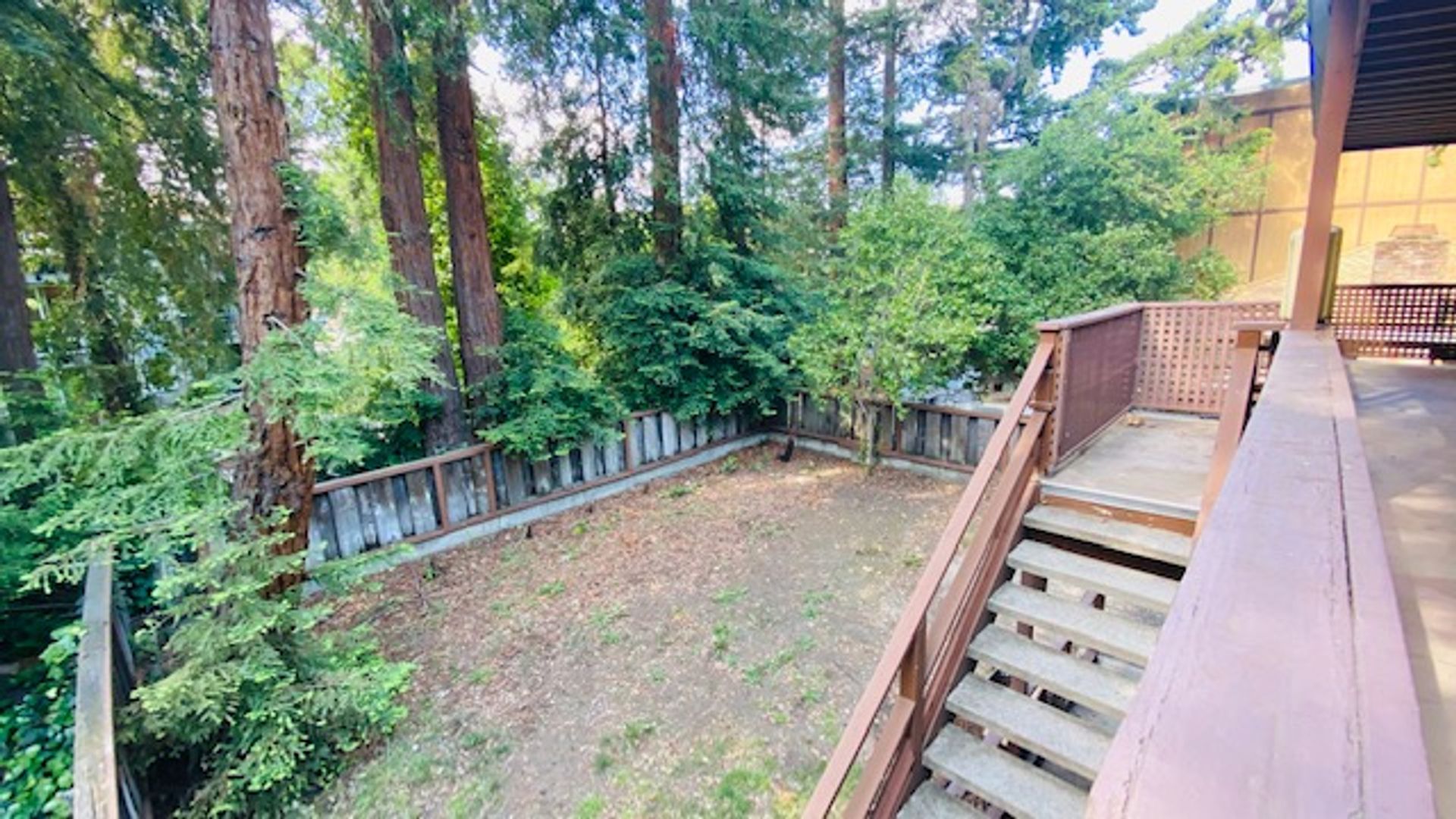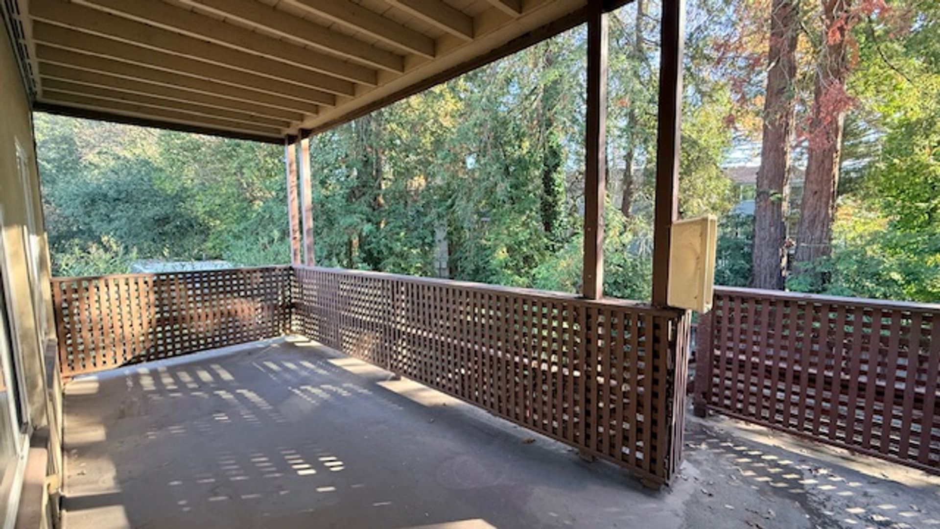 • Spacious living room and dining area with large windows and views of majestic Redwood trees