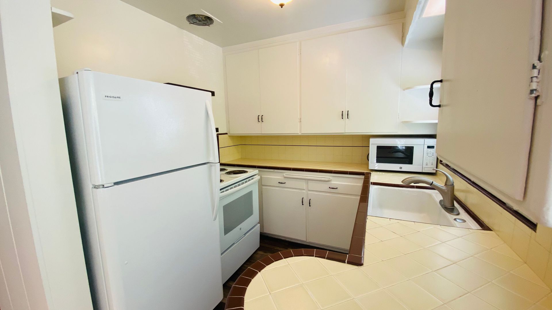 • Kitchen with refrigerator, 4 burner electric stove/oven, ample cabinetry, tile countertops, and single-bowl sink with pullout faucet