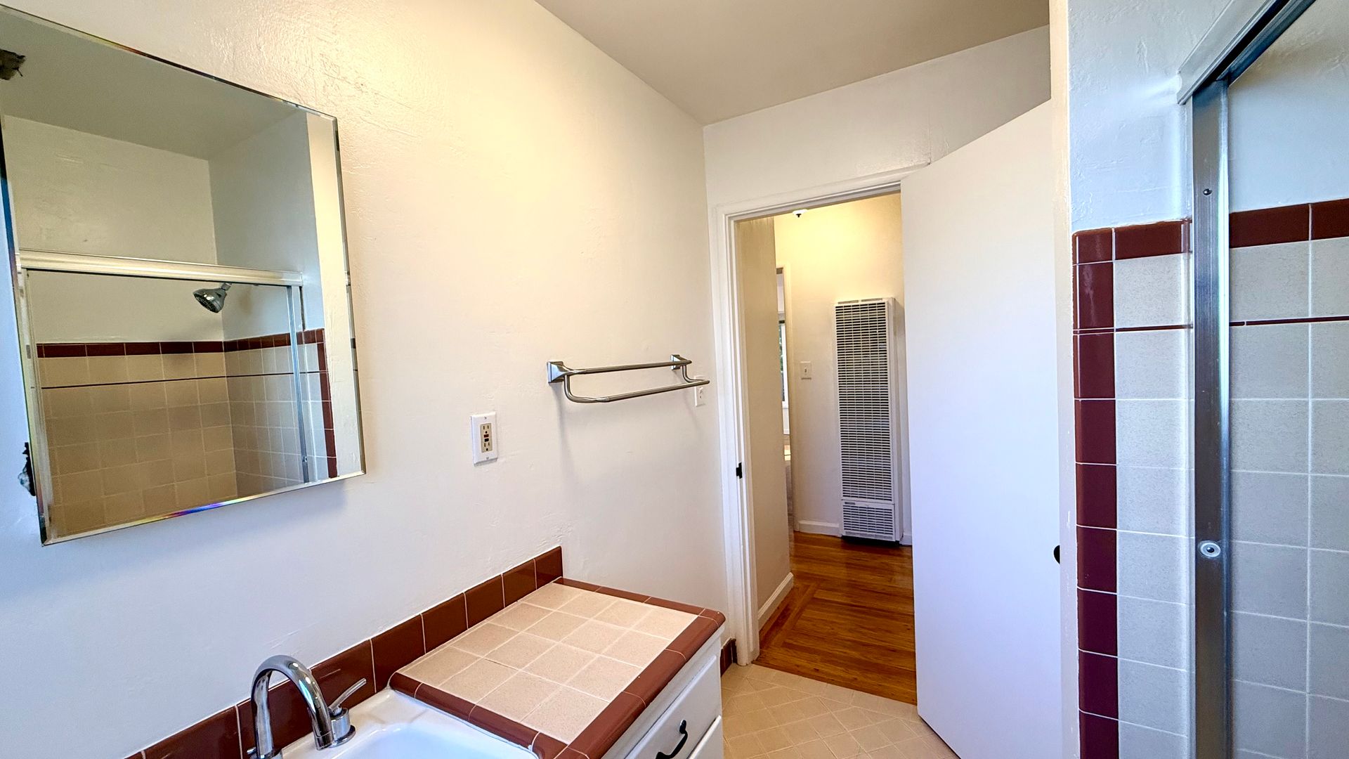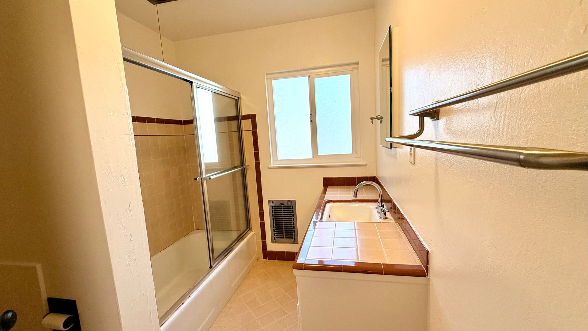 • Bathroom with single-sink vanity, tile countertops, and shower-over-tub with enclosure